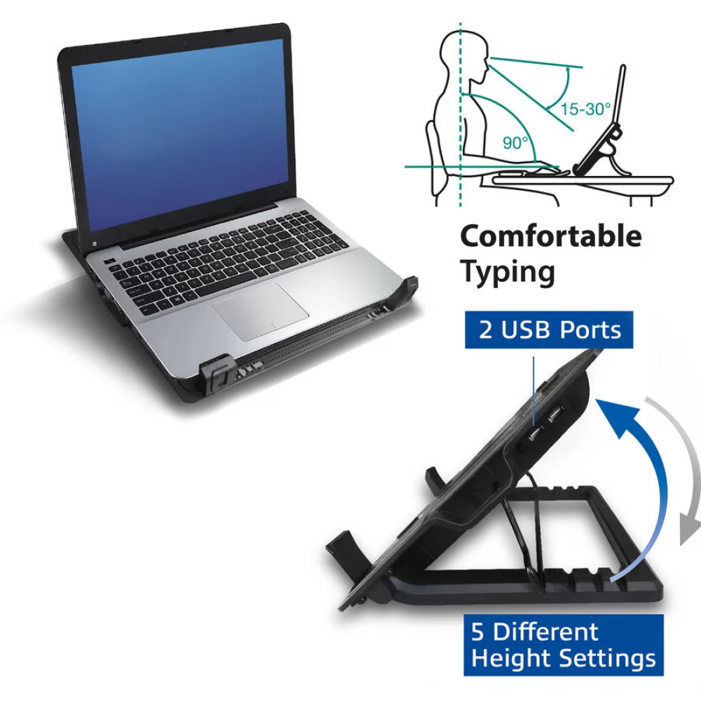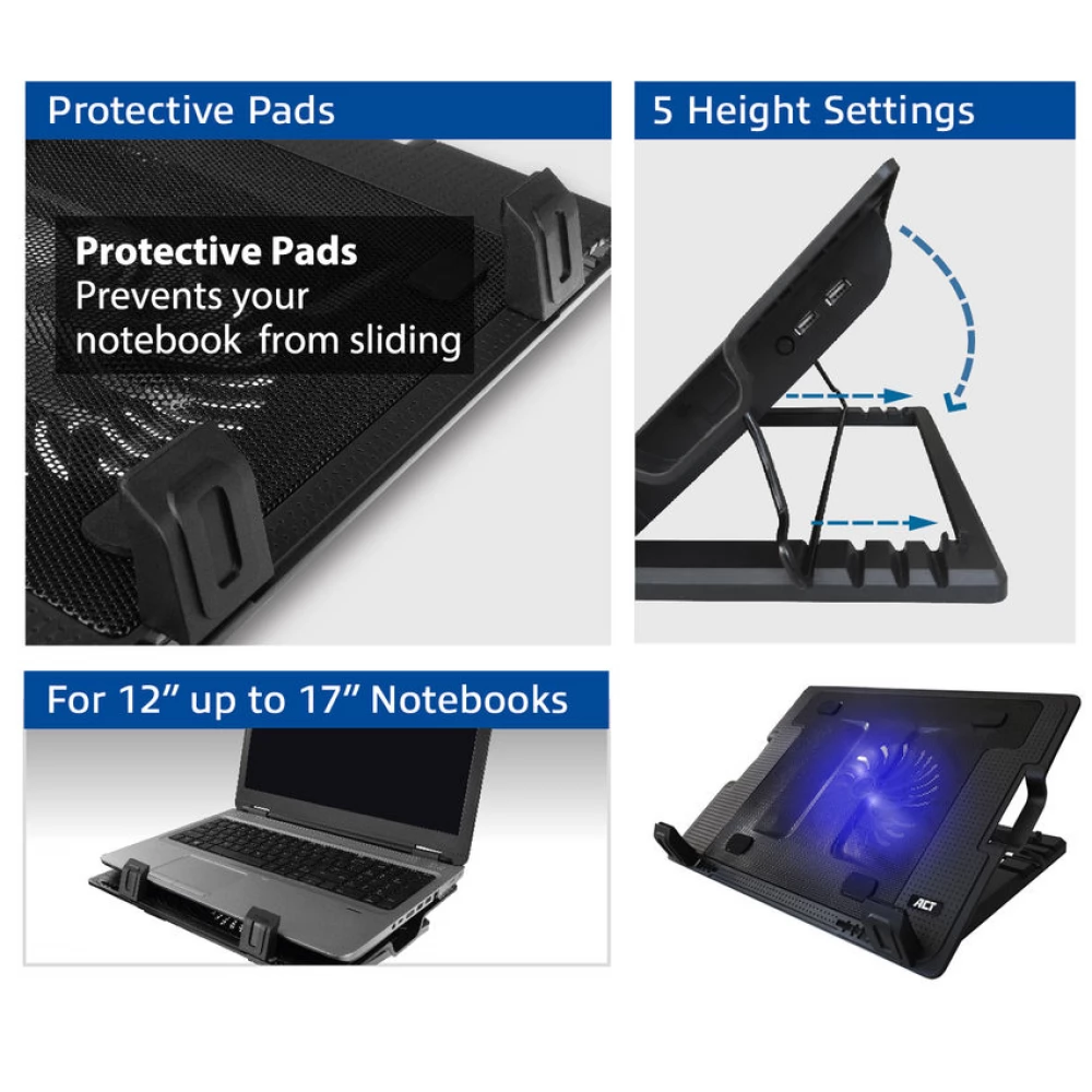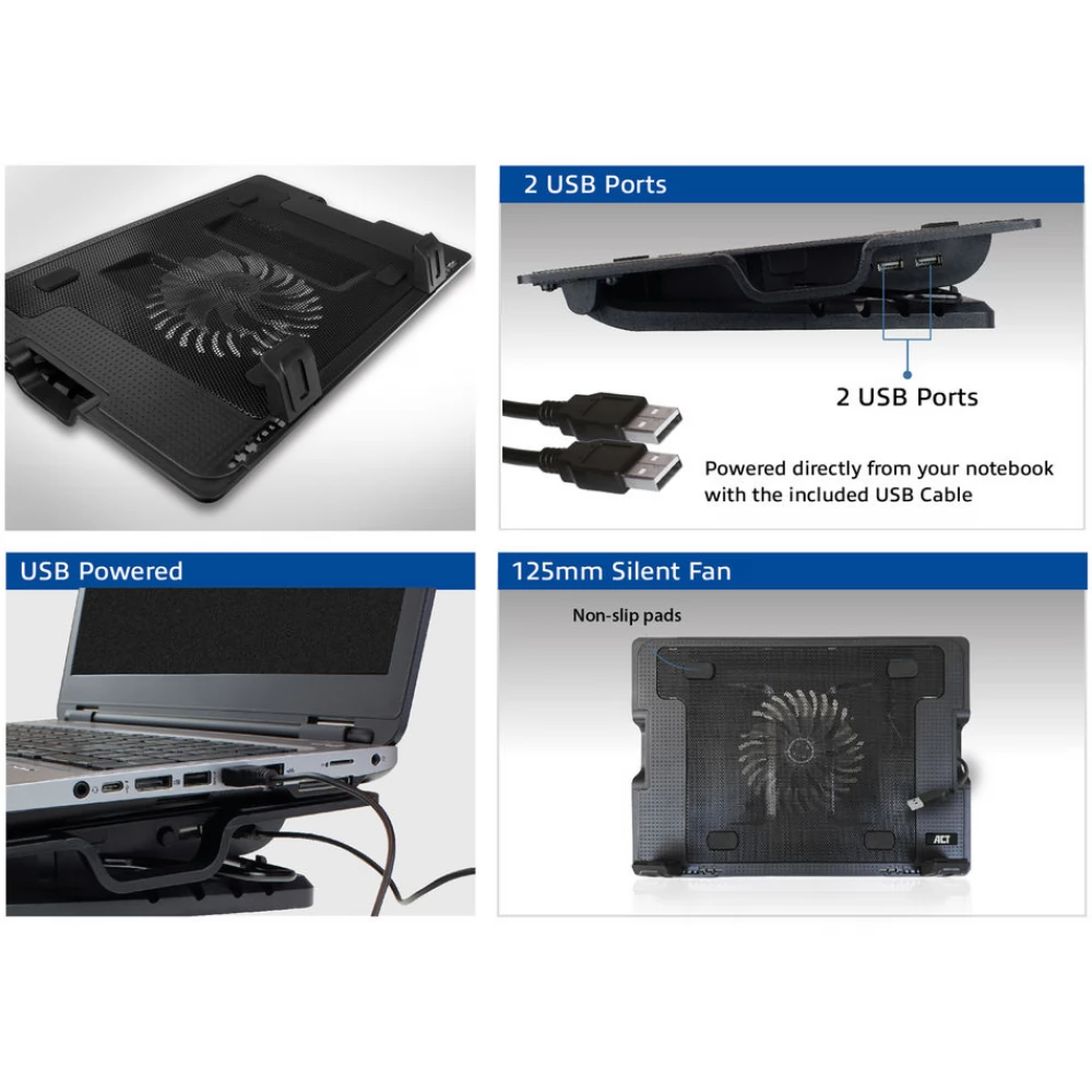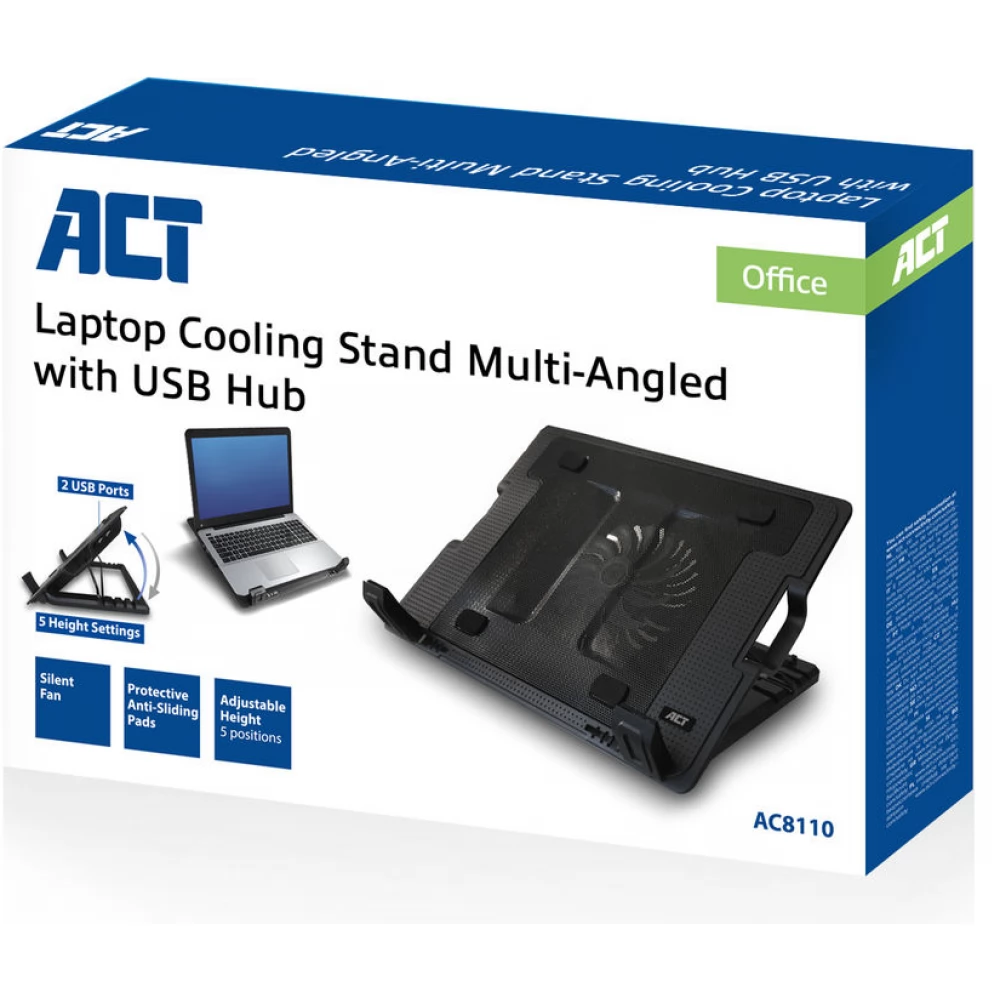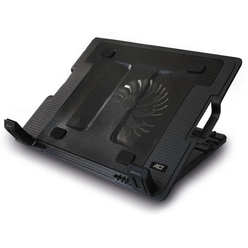 The ACT AC8110 multi-angle laptop cooling stand features a metal mesh surface and a powerful yet quiet 12.5cm fan to prevent devices from overheating. This versatile stand can also be used as a laptop stand or cooling pad. The AC8110 is USB powered, so you don't need an external power supply. The AC8110 can be adjusted to 5 different viewing angles to create the ideal working height. Additionally, the AC8110 adds 2 additional USB ports to your notebook. Non-slip rubber feet keep the stand in place.