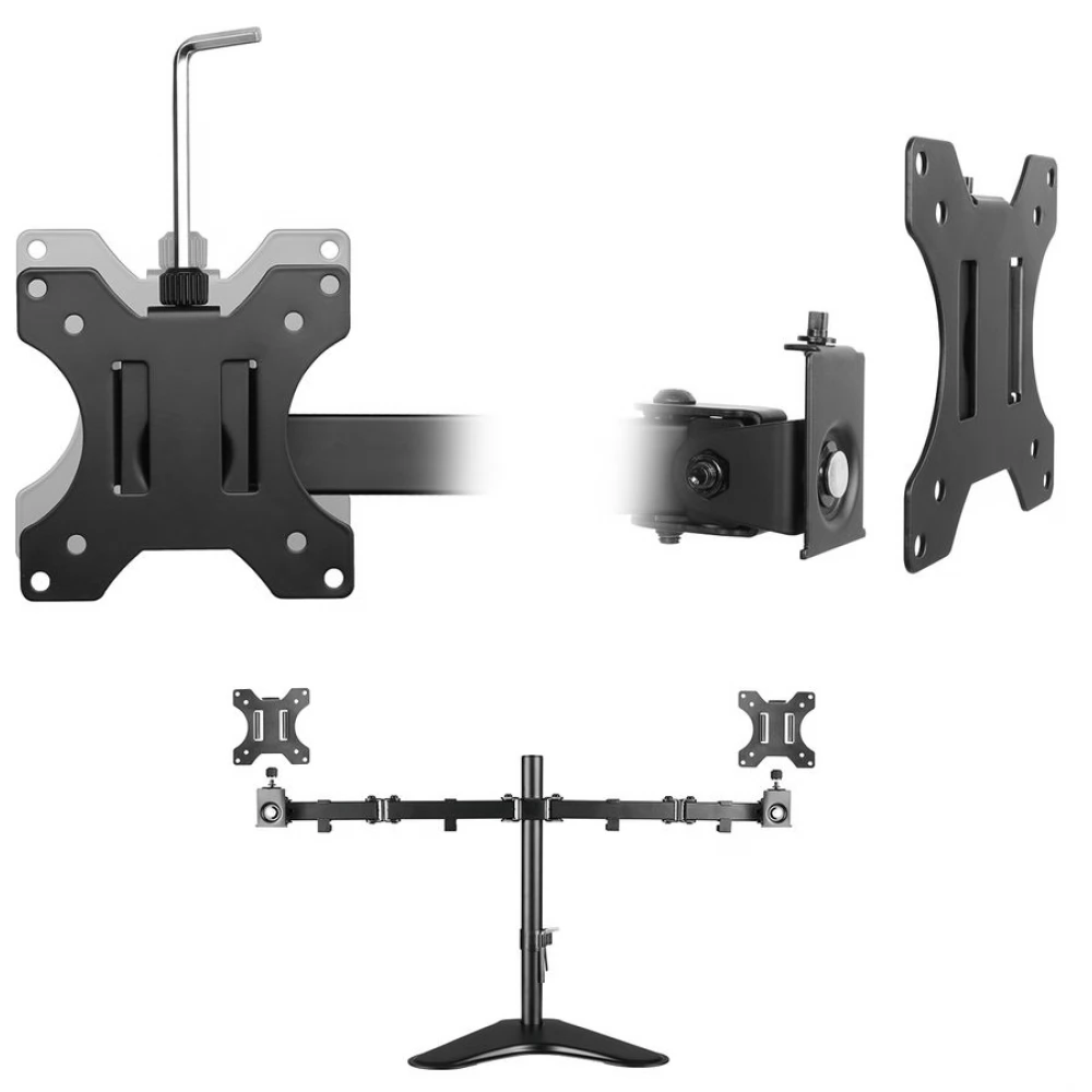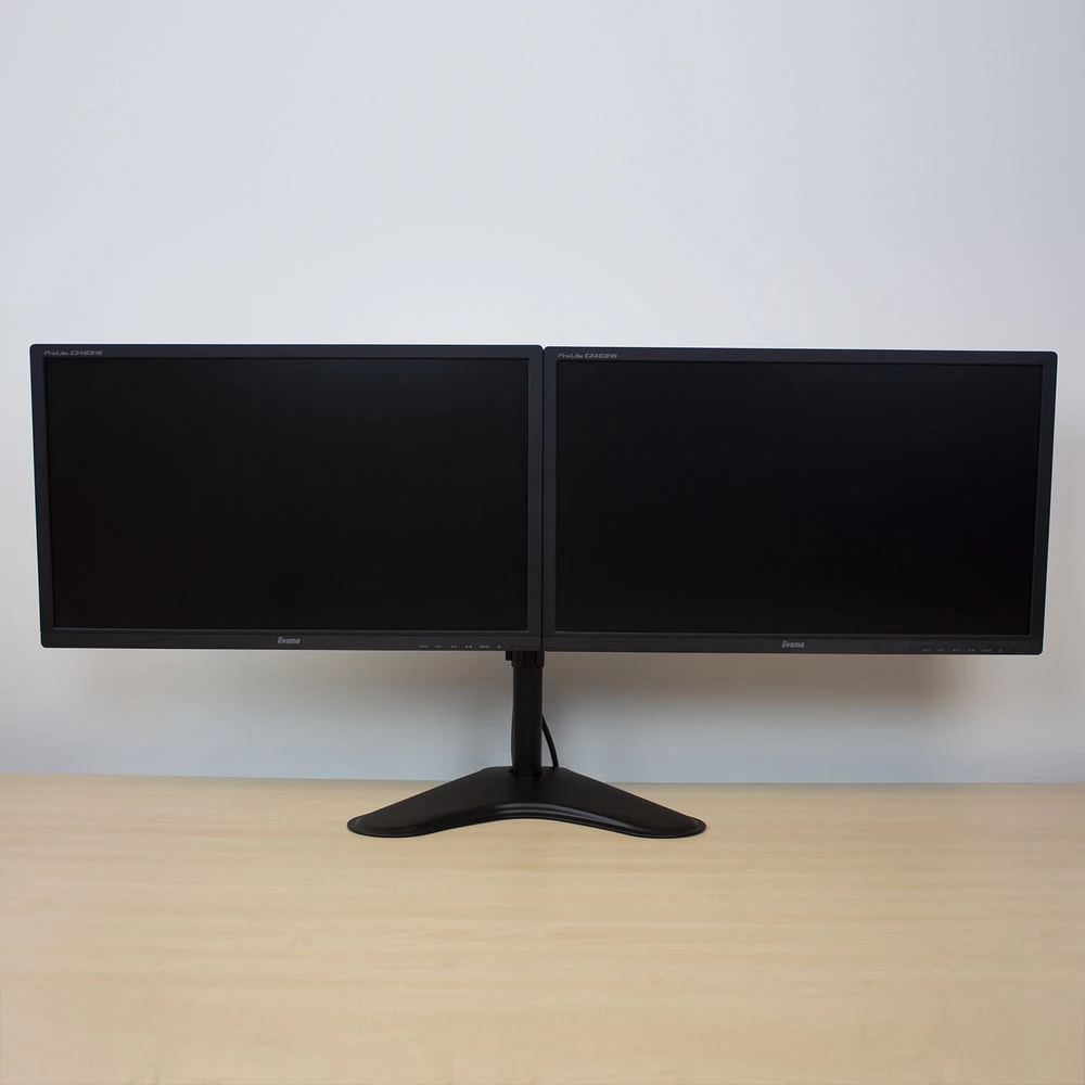 Double-monitor, tiltable, rotatable desktop monitor stand up to 13-32" display size.