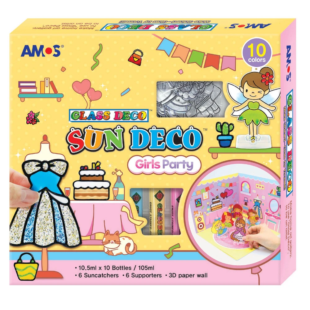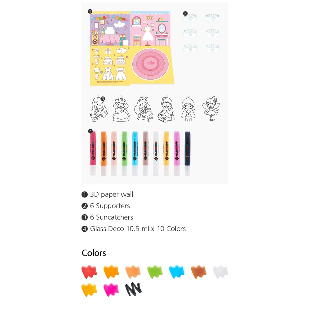 Glass sticker paint set with 10x 10.5 ml paint, 6 glass stickers, pedestal and a cardboard wall that can be decorated with stickers.