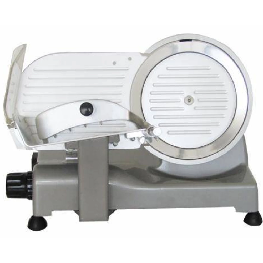 professional slicing machine pressed aluminum cover 25 cm chrome steel blade belt drive motor quiet operation single-phase induction motor adjustable slice thickness: 0-15 mm adjustable blade sharpener (accessory) slide slide with self-lubricating bearing slide tilt angle: approx. 20° aluminum accessories power: 140 W220V - 50Hz weight: 14 kg dimensions: height: 37 cm, depth: 41 cm, width: 37 cm 2 year warranty