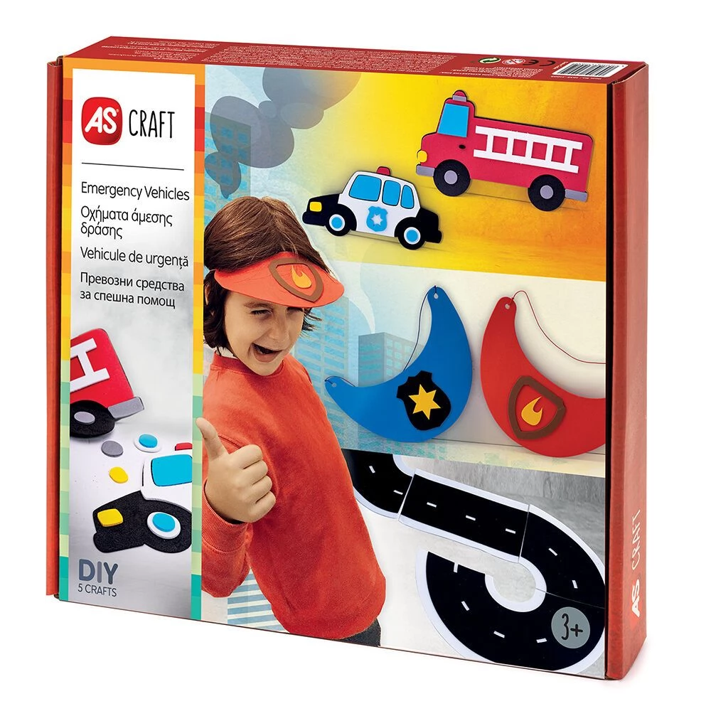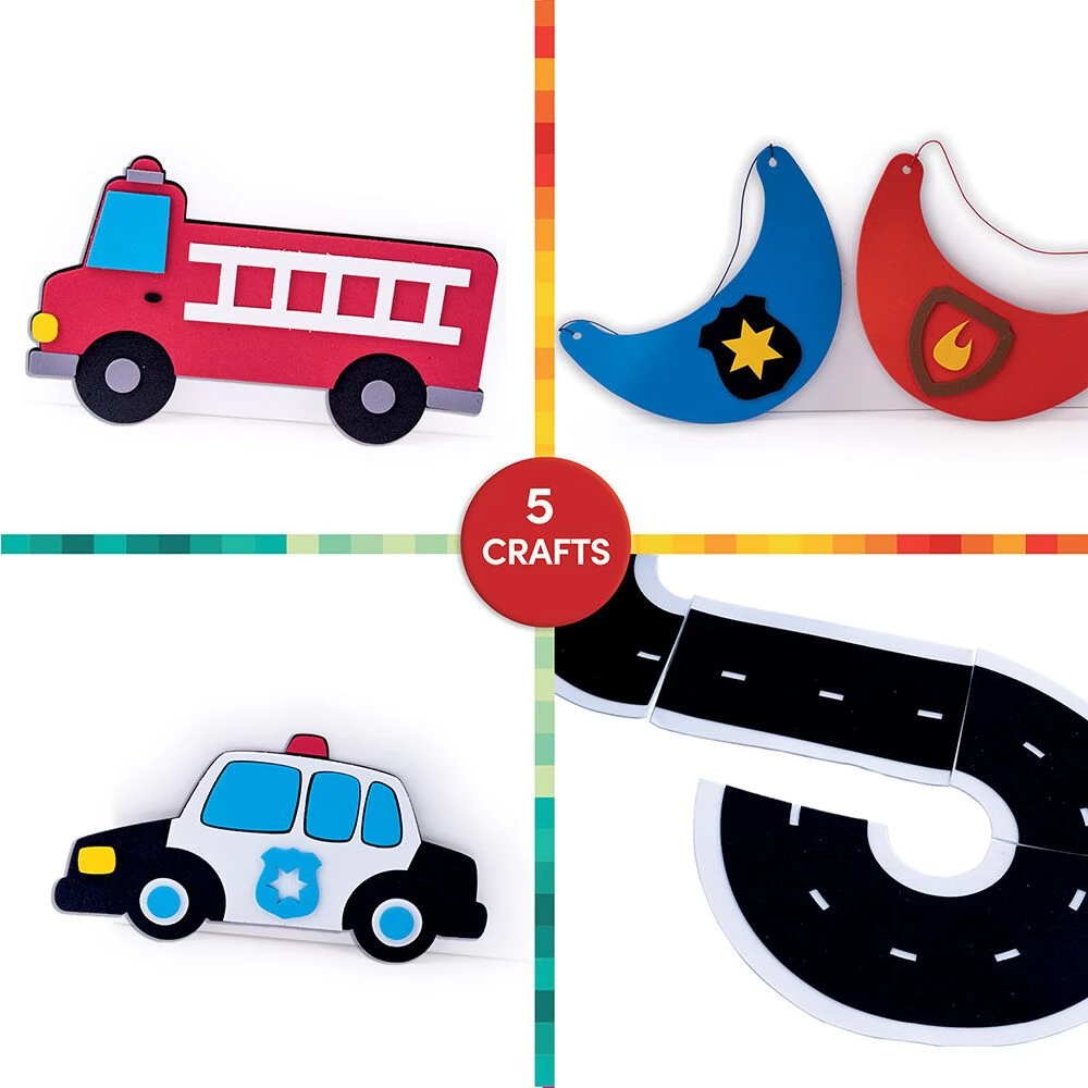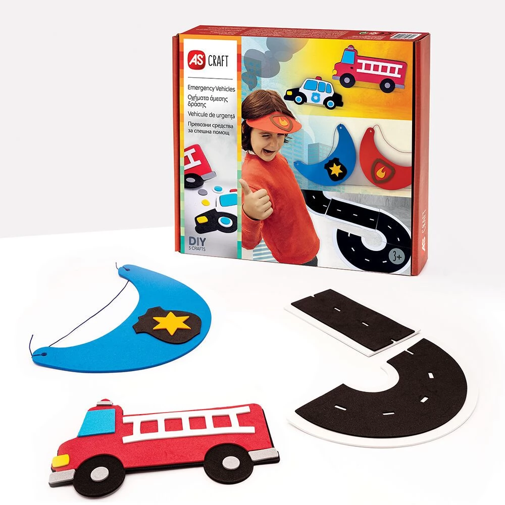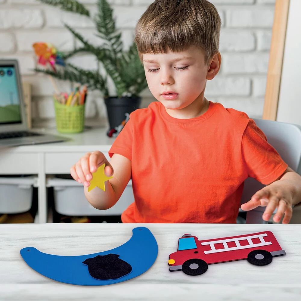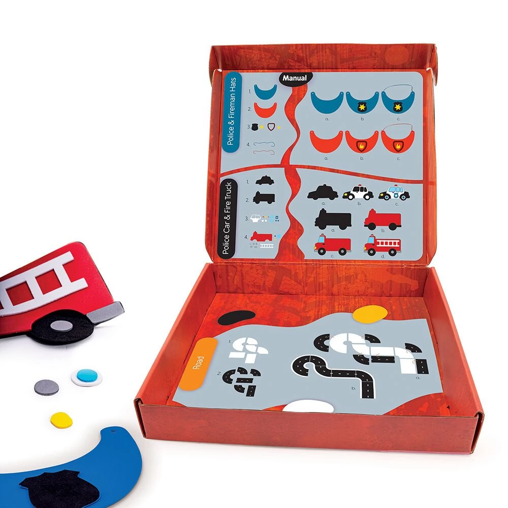 Creative felt set, the elements of which can be used to create a policeman and firefighter pattern sun visor, a fire engine, a police car and a road section.