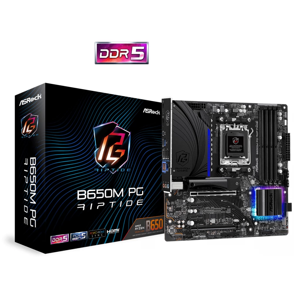 The ASROCK B650M PG Riptide motherboard is based on the AMD B650 chipset, which is specially designed to support AMD Ryzen 7000, 8000 and 9000 series processors. This Micro ATX motherboard is part of the Phantom Gaming series, which focuses on high performance and the needs of gamers. Its modern technological equipment and excellent expansion options make it ideal for building compact, yet powerful gaming PCs.