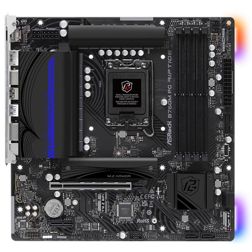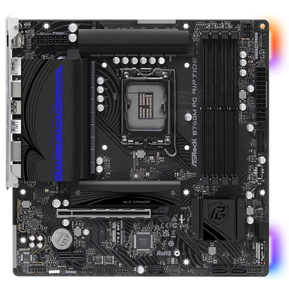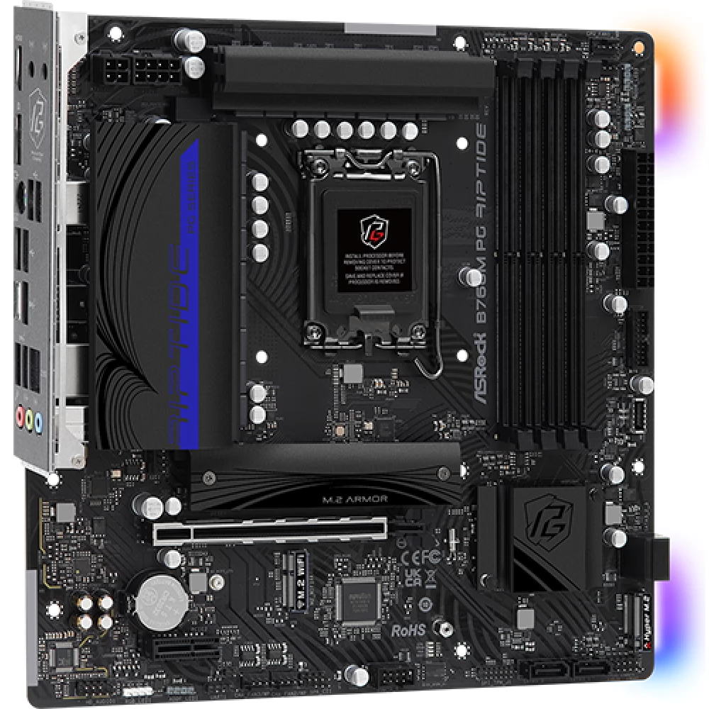The ASRock B760M PG Riptide motherboard is based on the Intel B760 chipset, which supports Intel® 14th, 13th and 12th generation Core™ processors. This Micro ATX format motherboard offers high performance and outstanding functionality in the mid-range market, which can be an ideal choice for gamers and performance-oriented users. Whether for gaming, work or multimedia applications, this motherboard offers the user exceptional speed, durability and flexibility.