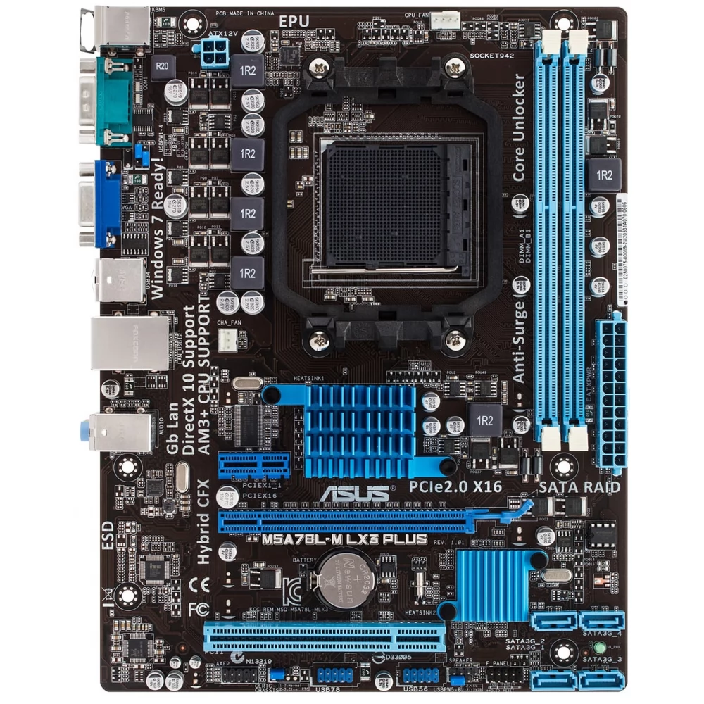 ASUS M5A78L-M LX3 PLUS/C/SI type motherboard with Socket-AM3+ slot, AMD 760G chipset, AMD RadeOn HD3000 integrated video card, 2 DDR3 memory slots (max 16GB). 8 USB 2.0 ports.