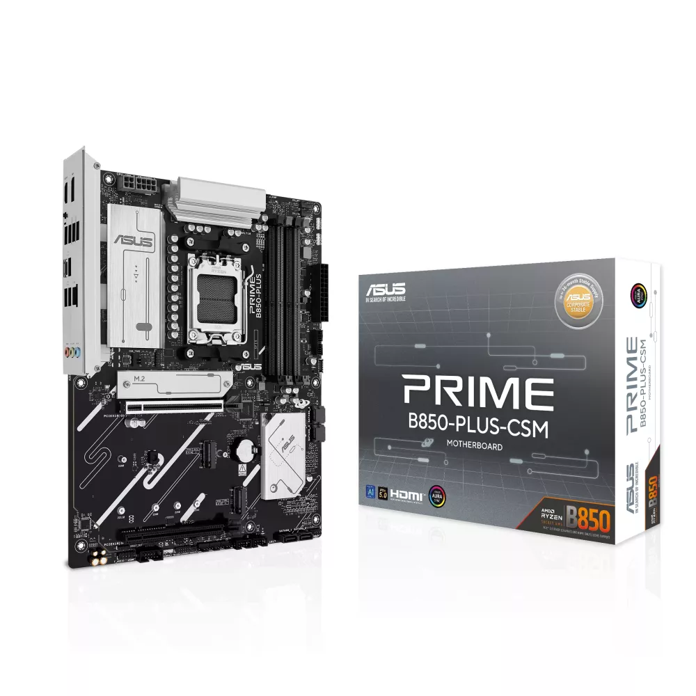 ASUS Prime B850-Plus-CSM motherboard with SOCKET-AM5 socket, AMD B850 chipset, processor integrated video card, 4 DDR5/CUDIMM memory socket (max 256GB). 6 USB 2.0 ports, 5 USB 3.0 ports, 4 USB 3.1 ports.