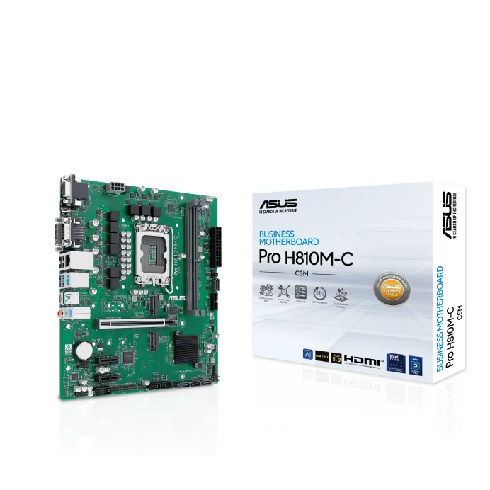 ASUS PRO H810M-C-CSM motherboard with LGA-1851 slot, Intel H810 chipset, processor integrated video card, 2 DDR5/CUUDIMM memory socket (max 128GB). 6 USB 2.0 ports, 6 USB 3.0 ports, pieces of USB 3.1...