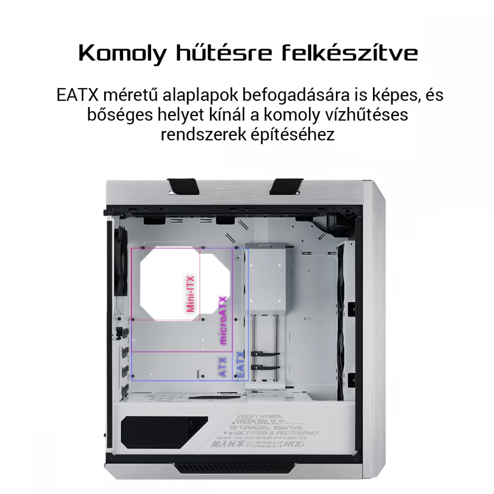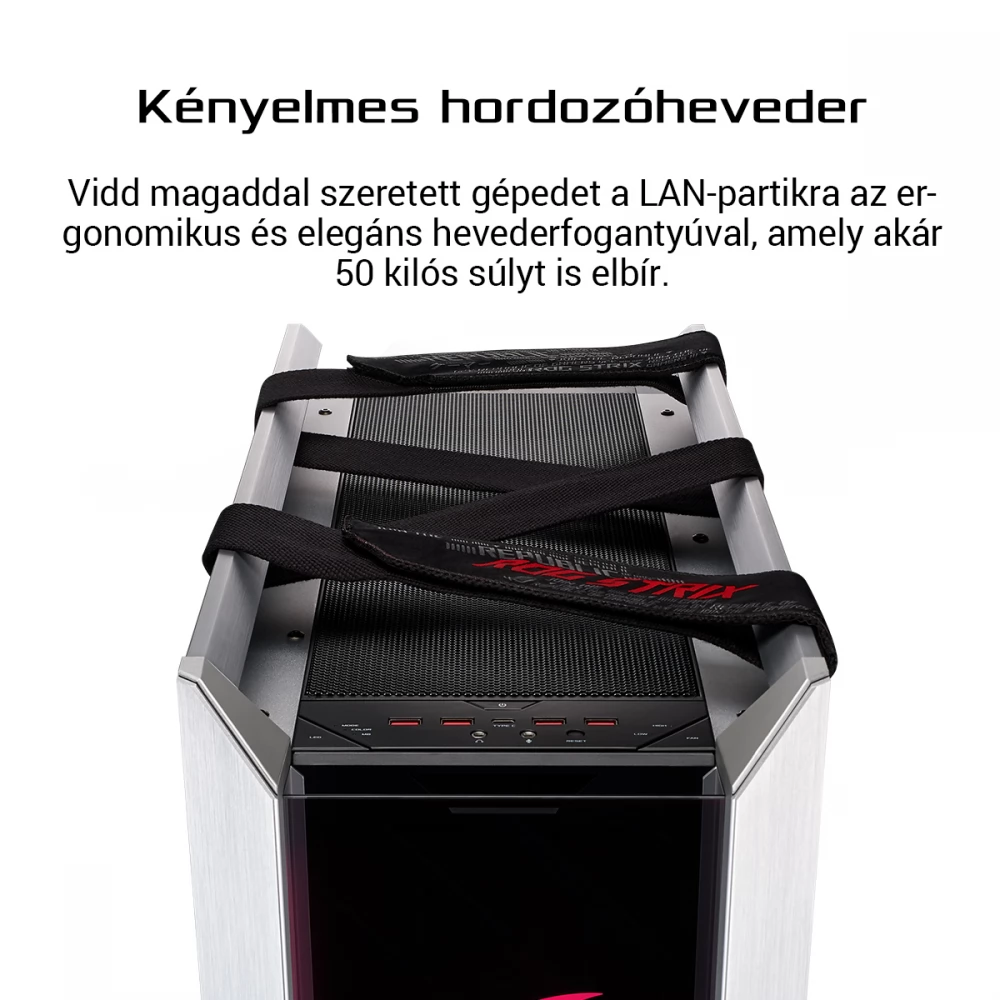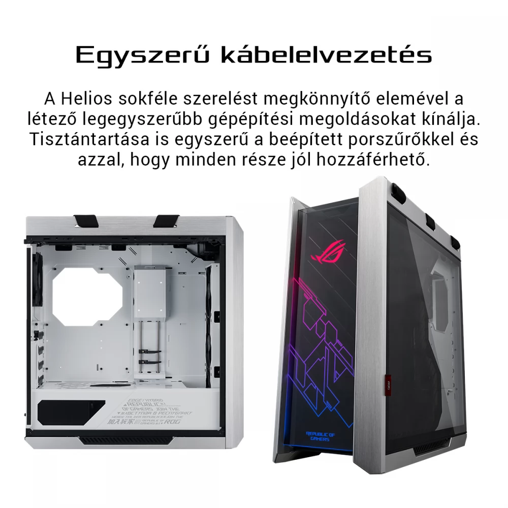 E-ATX format Midi tower computer case with RGB visual elements. ROG Strix Helios is a high-quality midi-tower case for building gaming machines, with three hardened steel panels, a fine-looking aluminum frame and integrated front RGB lighting. The multi-functional cover element with built-in cable organizers and GPU fasteners provides an organized, clean look inside the machine as well. The housing, designed with expandability and performance considerations in mind, can even fit an EATX motherboard and serious water cooling – making it a perfect choice for building a classic ROG display machine. With built-in addressable RGB LEDs on the front, whose operation can be customized with a dedicated control button or the Aura software, ROG Strix Helios can shine in a million colors and flash a variety of light effects.