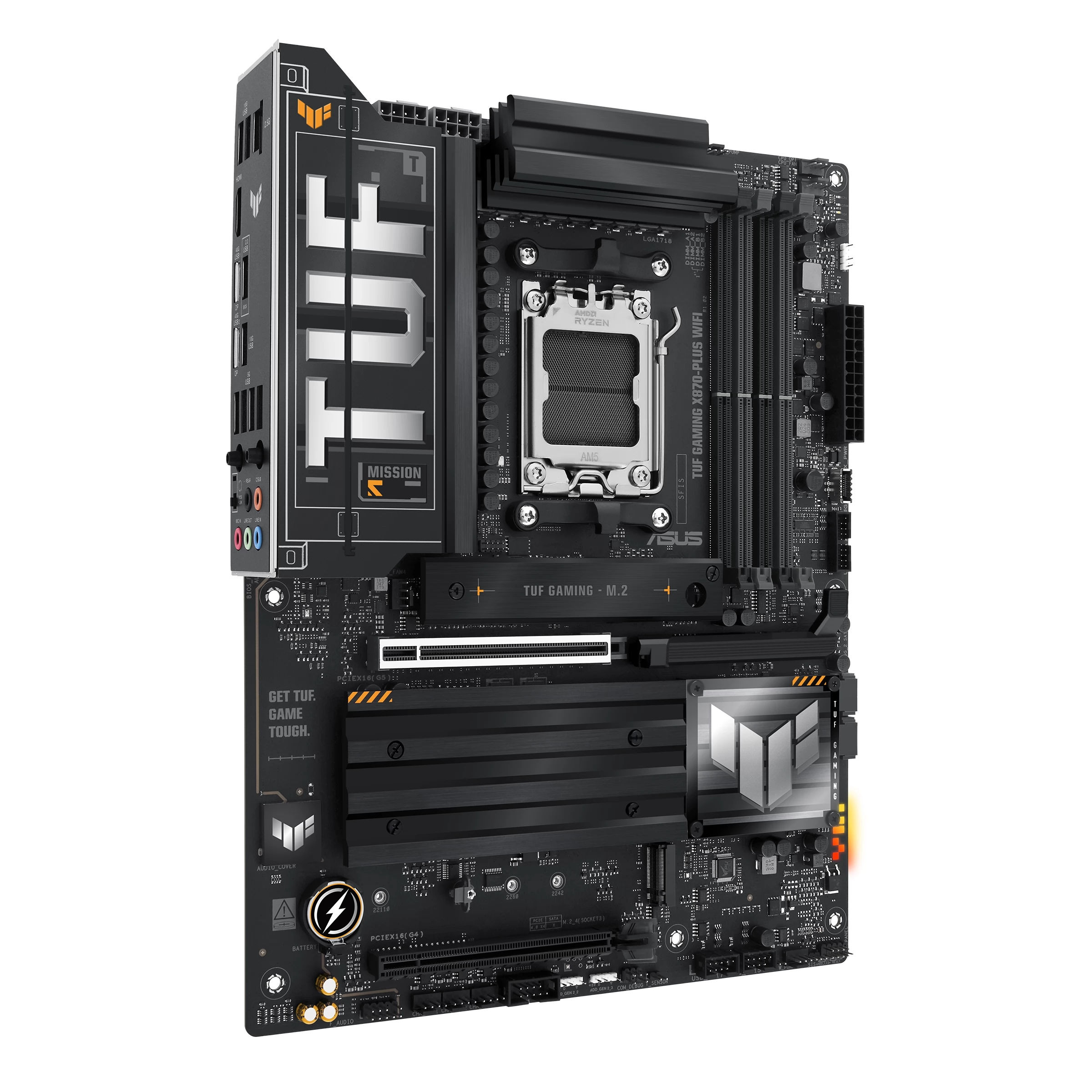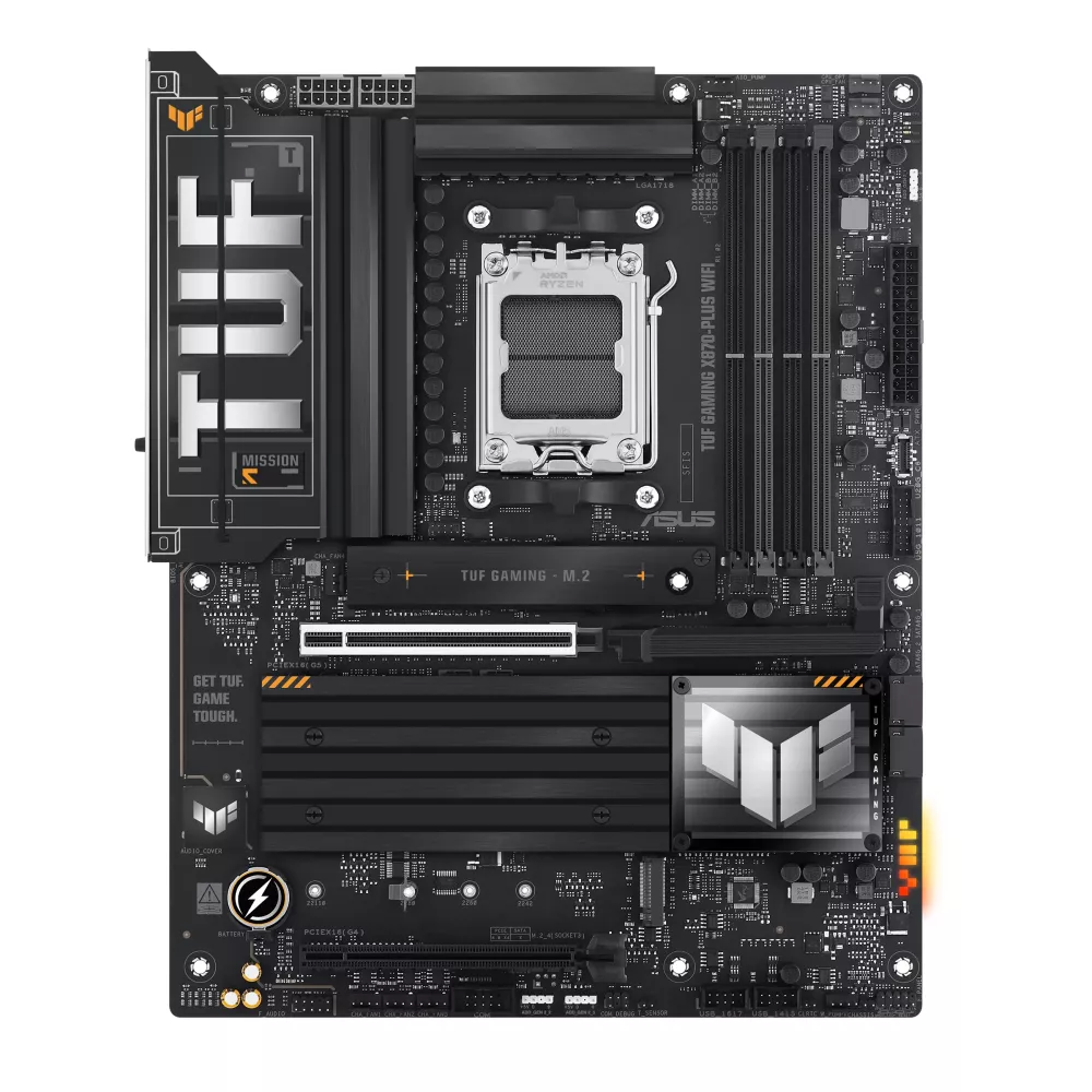 Asus tuf gaming x870-plus WiFi motherboard with socket-am5 socket, AMD X870 chips, processor integrated video card, 4 DDR5/CUDIMM memory slot (max 256GB). 5 USB 2.0 ports, 6 USB 3.0 ports, 3 USB 3.1 ports.