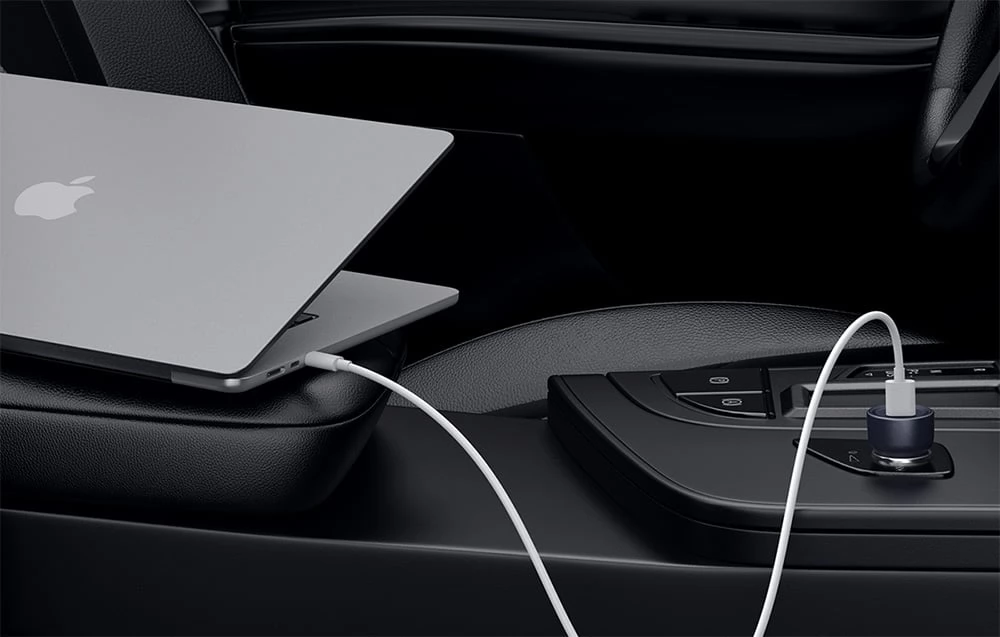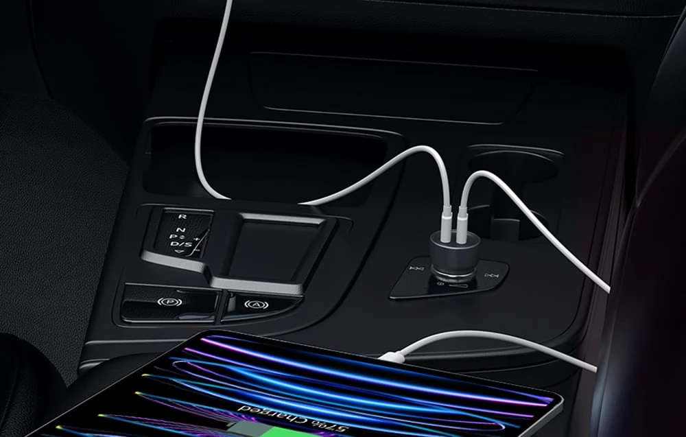 65W car charger with 2 USB-C connections that can be placed in the place of the cigarette lighter.