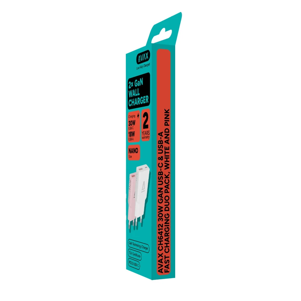 The AVAX CH6412 GaN fast charging duo set offers a modern, high-performance and compact solution for everyday charging needs. The package contains two charging heads - in white and pink - that have both USB-C and USB-A outputs, so they are suitable for charging several devices at the same time.