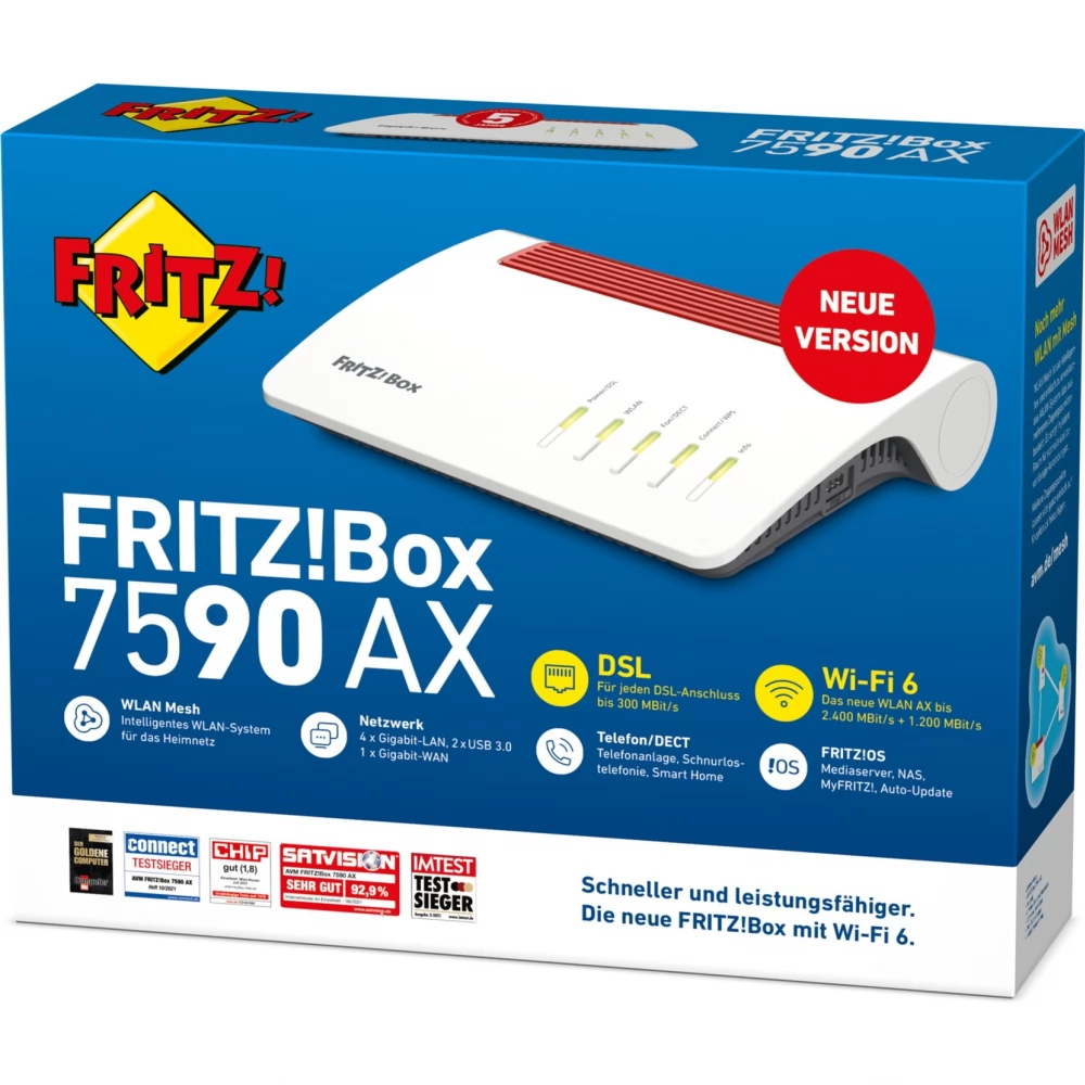 High-speed downloads and streaming entertainment - with the FRITZ!Box 7590 AX, your home network is ready for everything. Wi-Fi 6 provides peak Wi-Fi speeds. DSL supervectoring with a speed of up to 300 Mbit/s leaves nothing to be desired. A wide range of functions for the home network and a complete telephone system with a DECT base station complete the outstanding services.