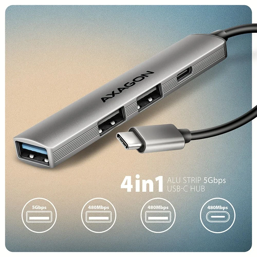 The thin aluminum USB-C 5Gbps AXAGON HUE-STC ALU STRIP hub easily and quickly connects up to four USB devices simultaneously to a laptop, computer or phone. You can connect your laptop to the hub with a 12 cm long USB-C cable.