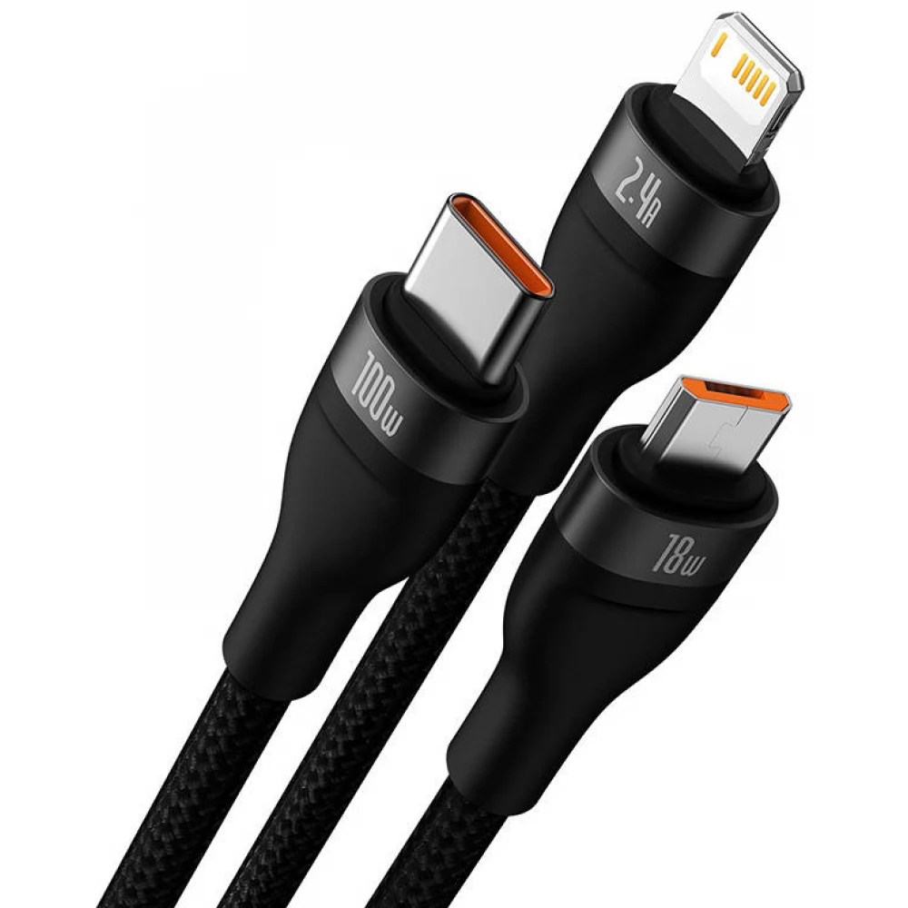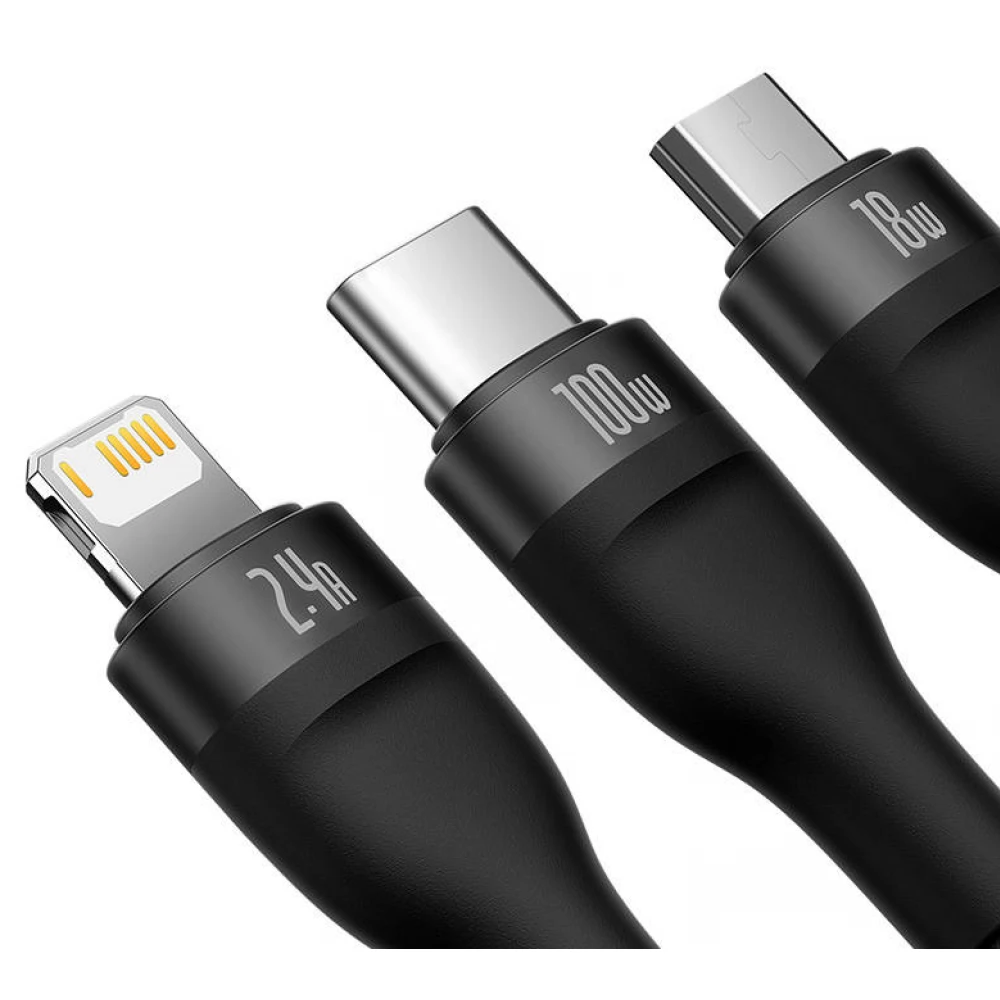 Black, 1.2m long USB - Lightning + Micro USB + USB Type C Converter cable.