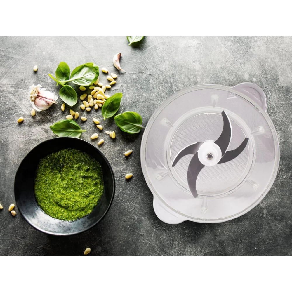 - The double stainless steel blades enable homogeneous grinding of the food throughout the container