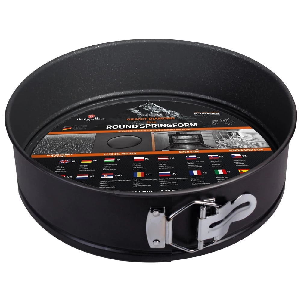 The Granit Diamond Line round cake pan with buckle is the perfect choice for every housewife who likes to bake. The aesthetic and practical shape is made of carbon steel and measures 28*6.8 cm, making it the ideal size for making cakes.