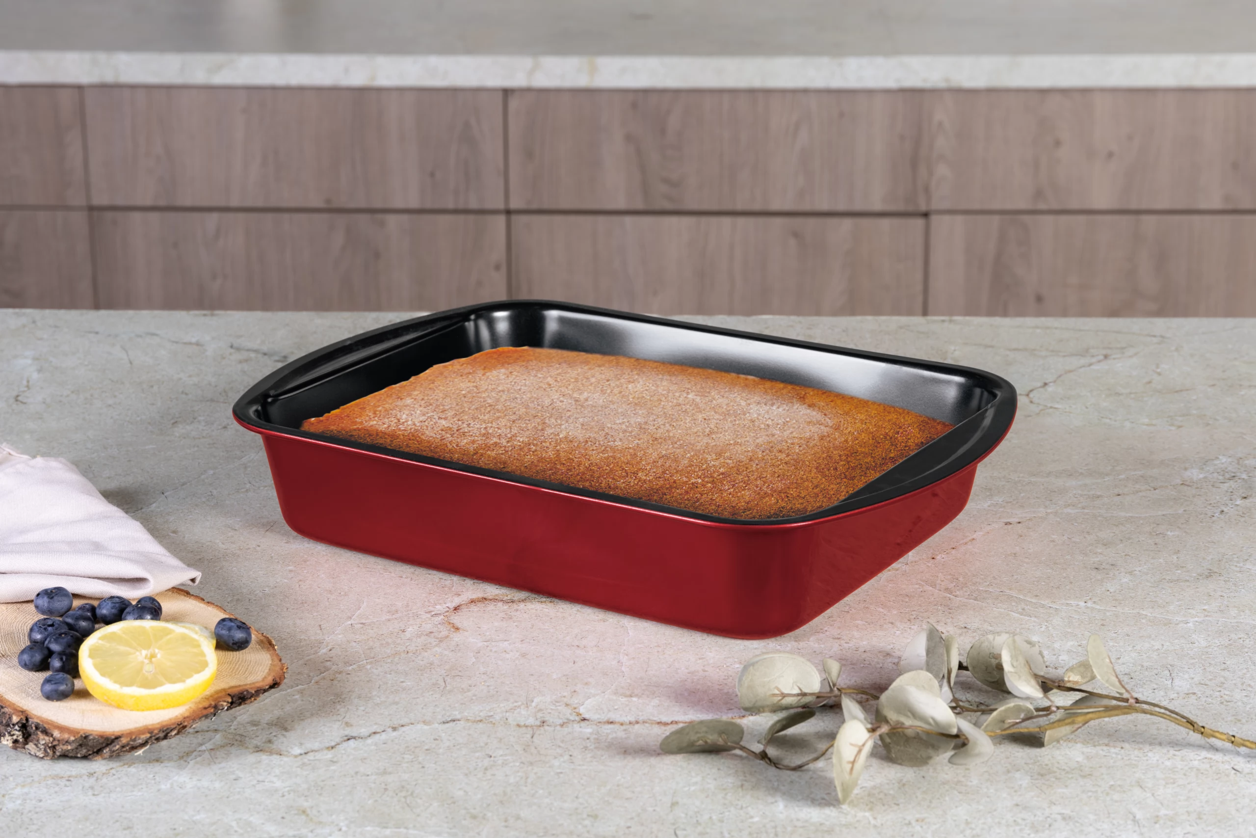 The Burgundy -colored, metallic baking pan gives the kitchen an elegant look. The stylish design provides not only the eye, but also the harmony between the kitchen utensils.