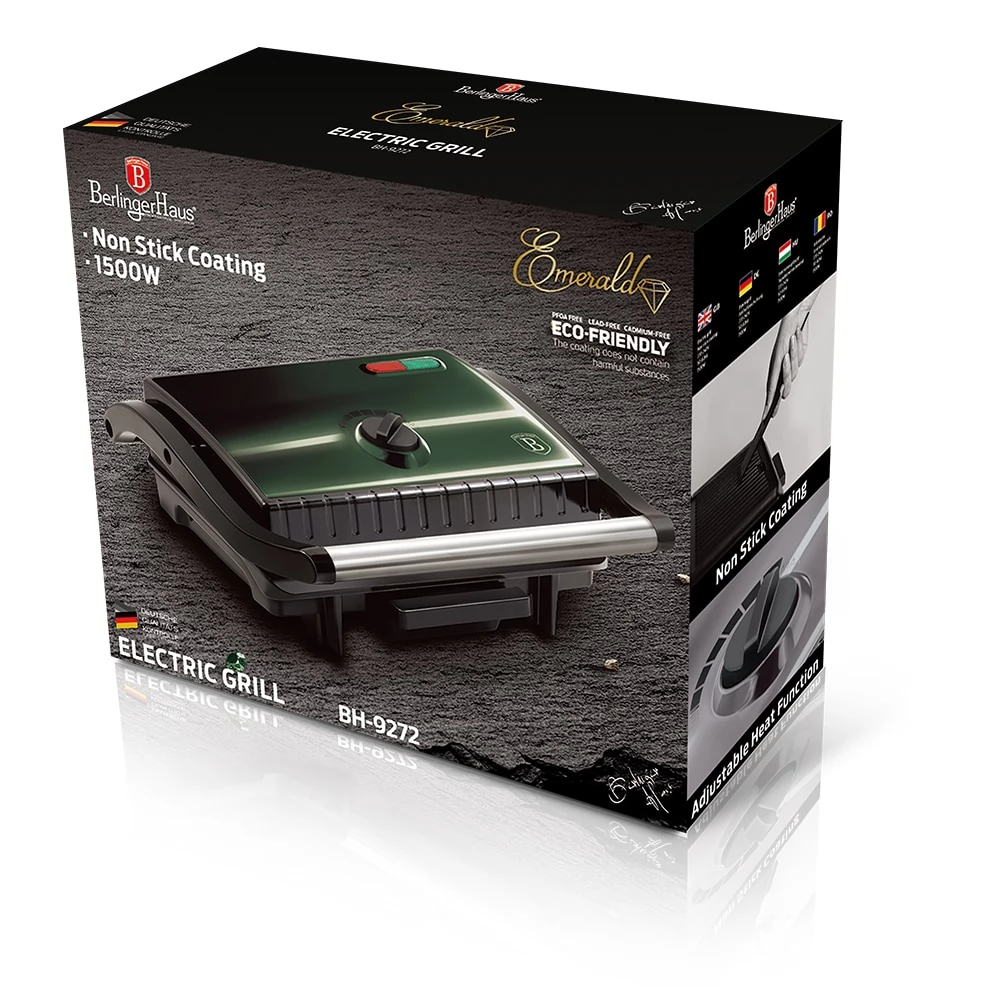 The Emerald Collection electric grill with oil dripper is the perfect tool for grilling lovers, which is not only practical, but also a stylish addition to the kitchen. The removable drip tray and non-stick coating allow for easy cleaning, so you don't have to worry about dirt after grilling. It can also be used as a panini press, a contact grill, or an indoor grill, so all kinds of food can be prepared with it. Choose the Emerald Collection electric grill and enjoy the simplicity and comfort of grilling!