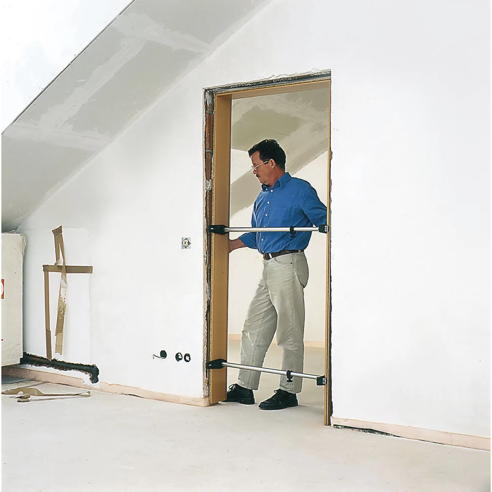 Gently and accurately fixes and supports the door case at the wall joint until the foam is fixed. Telescopic aluminum tube with adjustment screw for precise work. With clips on the clamping surfaces, the case can be supported and kept at an exact distance.