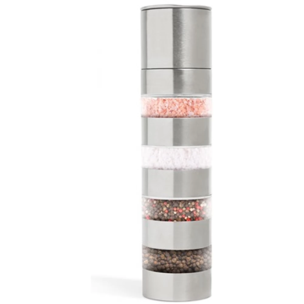 Spice mill made of stainless steel, which has 4 storage compartments, the order of which units can be changed freely, so you always have the spice you need at hand. The fineness of the grinding can be adjusted using a roller, depending on the quality of grinding you need.