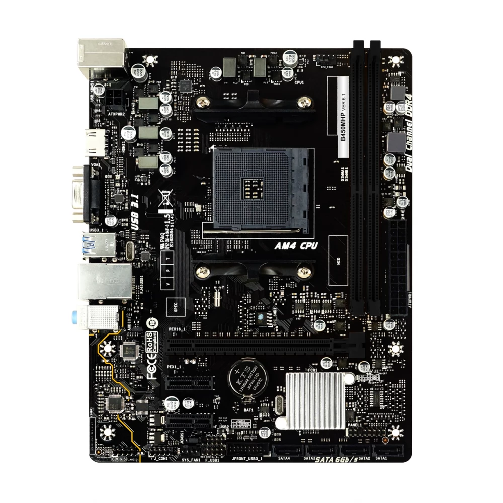 BIOSTAR B450MHP Ver. 6.1 type motherboard with Socket-AM4 slot, AMD B450 chipset, video card integrated in the processor, 2 DDR4 memory slots (max 64GB). 8 USB 2.0 ports, 4 USB 3.0 ports.