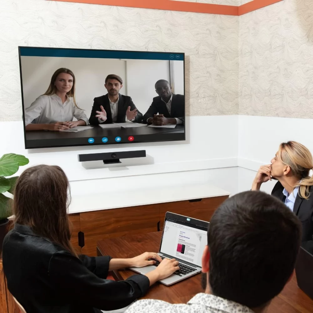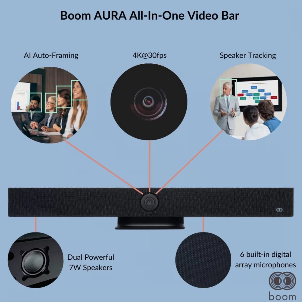 Video conference camera with 4K UHD resolution AI functions and 10x digital zoom with built-in microphone units that can be used flexibly in meeting rooms and halls of different sizes.