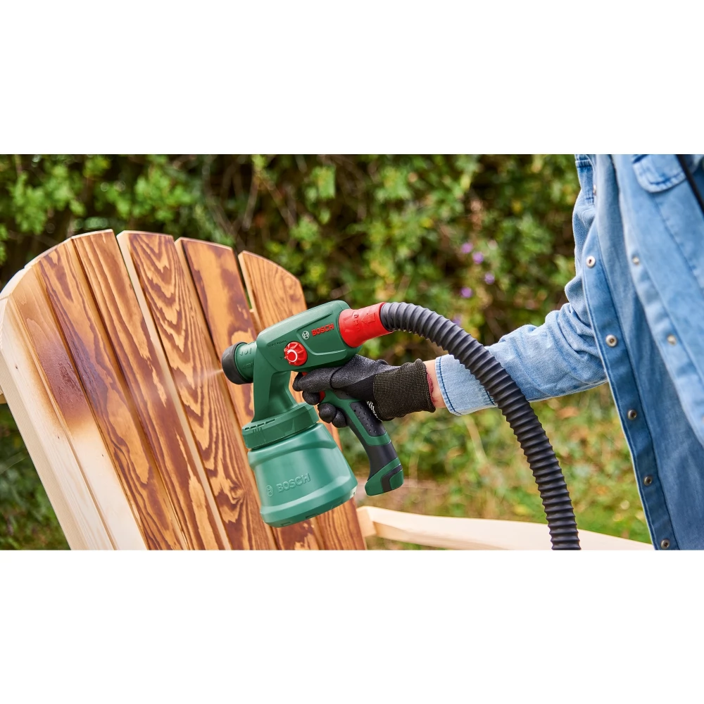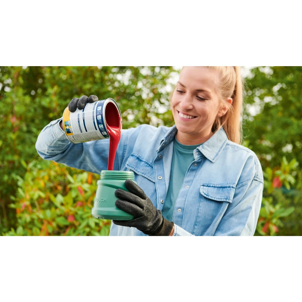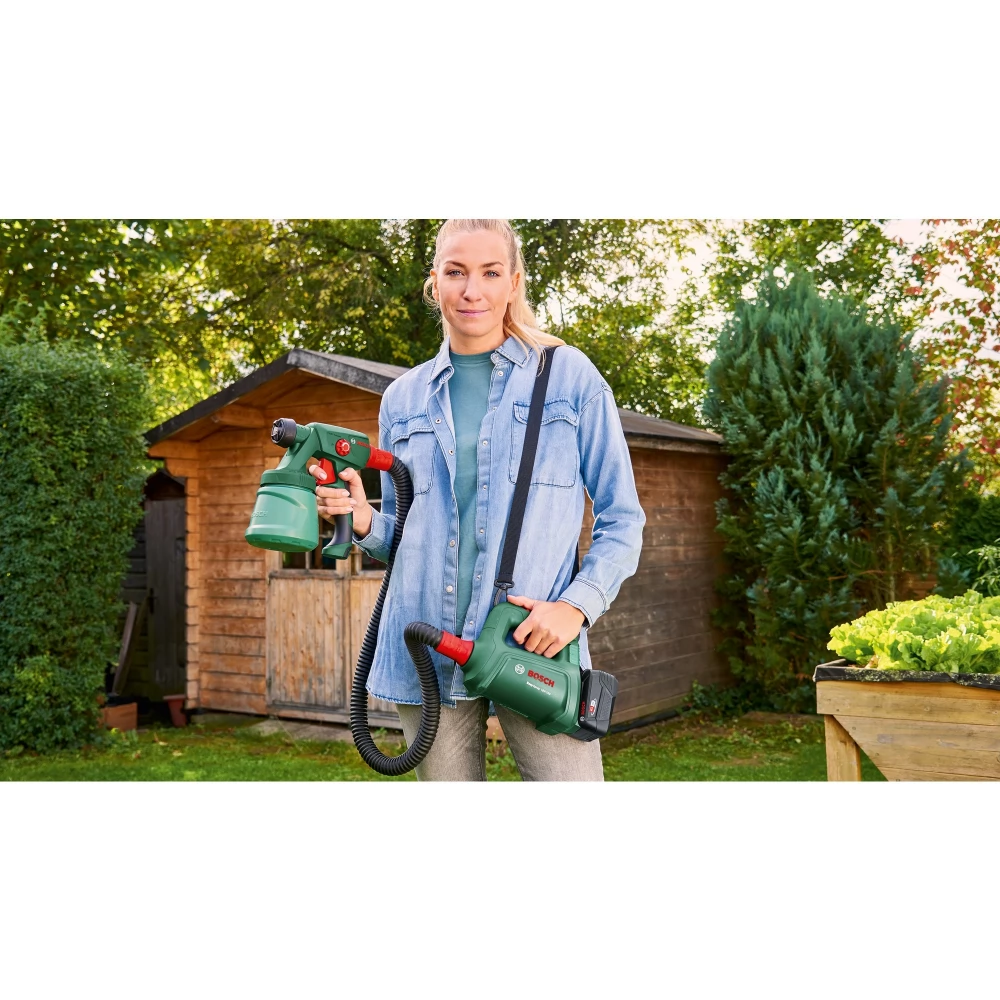 Smooth surface in seconds with the cordless Bosch EasySpray 18V-100 paint sprayer. Polishing and varnishing work can be done easily thanks to the light, compact spraying system of the tool and the high-performance 18V POWER FOR ALL rechargeable battery. Perfect results can be achieved even on uneven surfaces and in tight spaces, as EasySpray 18V-100 forms an even coating at a speed of 1 m²/minute. Additional features such as a quick start guide and 800ml paint tank ensure DIY jobs are completed faster, cleaner and with more joy. This tool is part of the POWER FOR ALL ALLIANCE system. A large number of tools of different brands can be operated with a single battery.