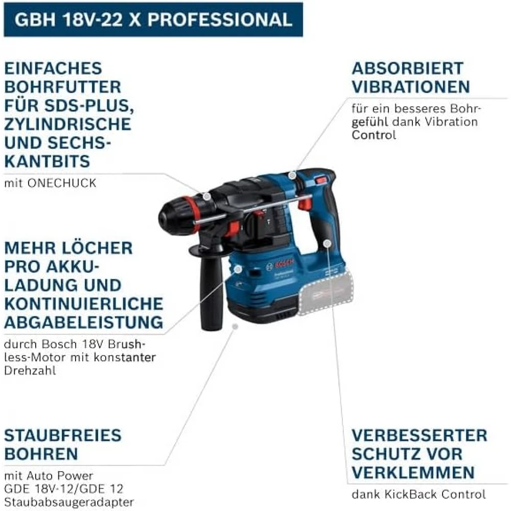 Thanks to the power and characteristics of GBH 18V-22 x X, it raises the drilling experience to a new level-even more efficiency, security and control. With one charge, you can make multiple holes and provide a steady performance with an efficient, constant speed of the Bosch 18V engine without a coal brush. Increased protection of the user at accidental jam and moderate vibration thanks to Kickback control and Vibration Control features. It also provides dust-free working conditions with the connected Auto Power GDE 18V-12 / GDE 12 exhaust. Onechuck with a stroke, which is the only chuck that can be fitted with SDS plus and cylindrical/hexagonal drilling heads for a variety of applications.
