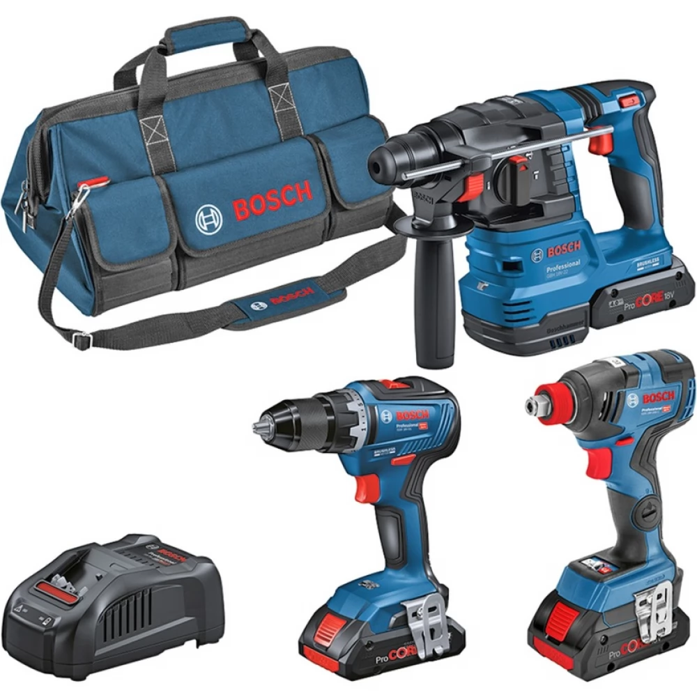 The Bosch Combi Set 18V: GSR 18V-55 + GDX 18V-200 + GBH 18V-22 includes a cordless drill, a cordless impact driver and an SDS plus hammer drill. The GSR 18V-55 Professional cordless drill and screwdriver offers excellent quality and durability thanks to its brushless EC motor. The robust and powerful cordless screwdriver with a high torque of 55 Nm and a speed of 1750 rpm ensures maximum efficiency, especially when working on wood and metal. Thanks to Röhm's 13 mm metal drill chuck, it provides a robust and ideal power transmission for a wide range of drilling and screwdriving tasks. The Bosch GBH 18V-22 Professional cordless hammer drill is suitable for hammer drilling in concrete, brick and stone, as well as for light chiseling work, as well as for impact-free drilling in wood, metal, ceramics and plastic. Compact, light and ergonomically designed, it has a good center of gravity, making it easier and less tiring to handle, especially when drilling overhead. With KickBack Control and Vibration Control, you can always be in control and reduce the strain on your hands and arms. It has a powerful impact system with 1.9 joules, three working modes (drilling, hammer drilling, chiseling) and more operating time with one battery charge. The GBH 18V-22 Professional hammer drill can be connected with a single click to the practical GDE 18V-12 Professional battery vacuum cleaner for greater cleanliness in the workplace. The Bosch GDX 18V-200 Professional cordless impact driver is a very compact 2-in-1 tool with a tool holder (1/4" hex and 1/2" square socket). It has a brushless motor that delivers a powerful 200Nm tightening torque, 350Nm breakout torque, excellent battery life and long tool life. Designed for tightening and loosening screws when working with sheet metal, metal and wood. Batteries are members of the AMPShare alliance. A single battery fits all tools and machines in the blue Bosch Professional 18 V system, but can also be used with many other tools from other manufacturers in the AMPShare Alliance, regardless of brand. You no longer need to buy a new battery for every new tool, you no longer need to search for the "right" battery, with the help of AMPShare one battery is enough for every job.