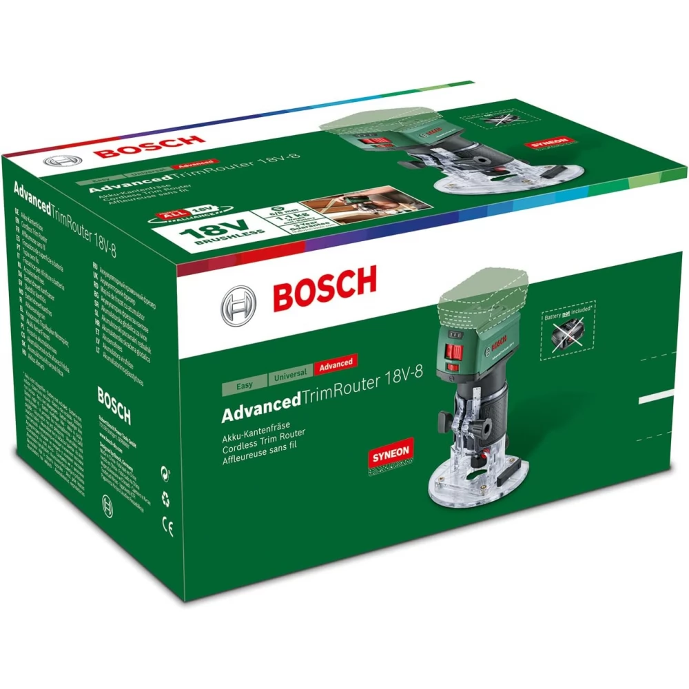 The compact AdvancedTrimRouter 18V-8 is easy and convenient to use - thanks to its compact design and low weight of 1.1 kg. Bosch's carbon brushless motor technology cuts grooves, engraved letters or other motifs in wood with the highest performance, while also having a significantly longer service life. For more flexibility, this end mill has 6mm and 8mm chucks – for different bit sizes. Energy efficiency and a long operating time are essential requirements for battery-powered tools - thanks to the intelligent Syneon technology, the energy consumption of the top cutter serves uninterrupted, undisturbed work. This tool is part of the POWER FOR ALL ALLIANCE system. A large number of tools of different brands can be operated with a single battery.