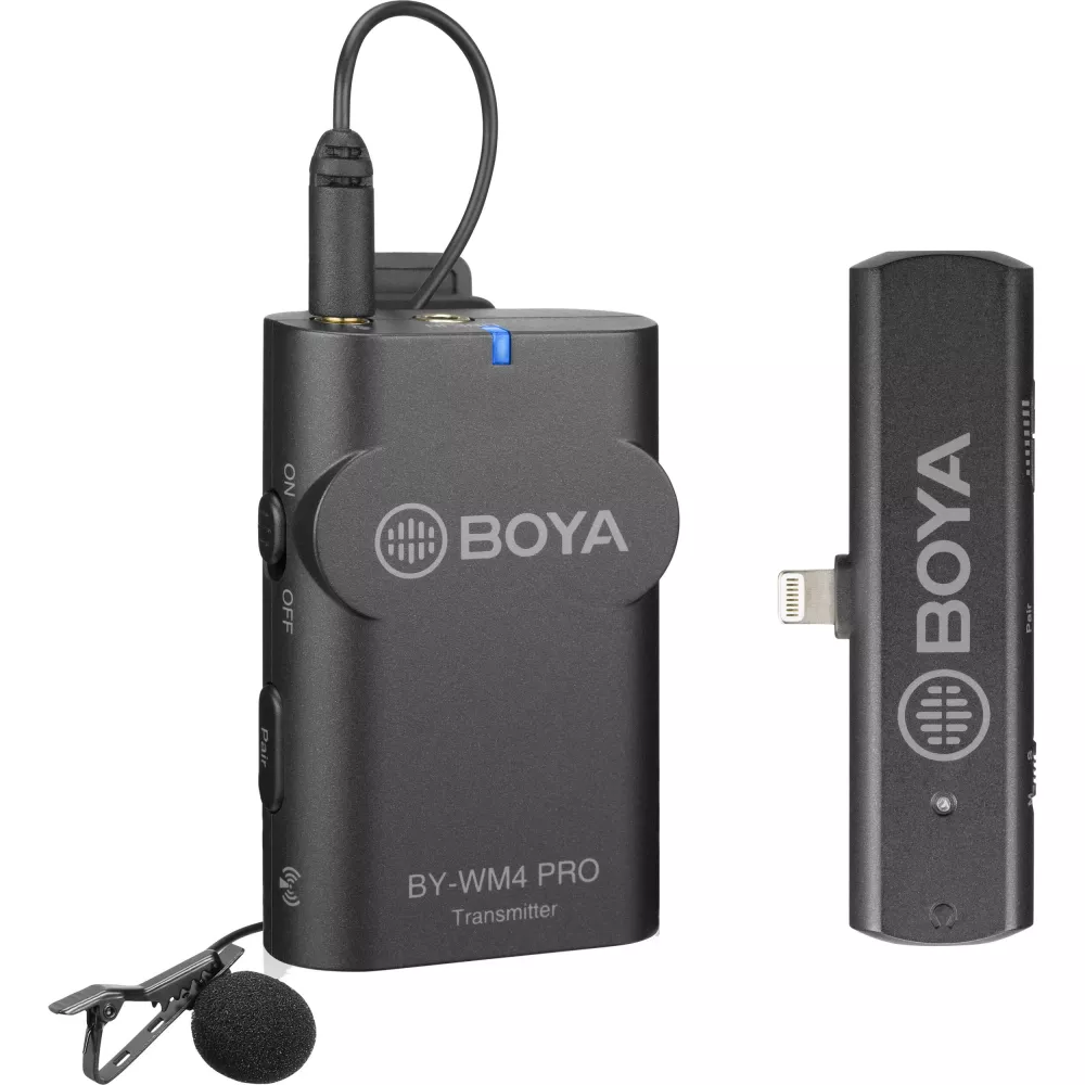 BOYA BY-WM4 PRO-K3 is a 2.4GHz wireless microphone system specially designed for iOS devices, which includes a body-mounted transmitter (TX4 Pro), a miniature receiver with Lightning connector (BY-WM4 PRO RXD), and an omnidirectional clip-on microphone.