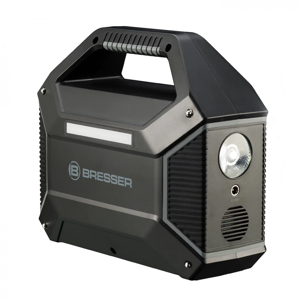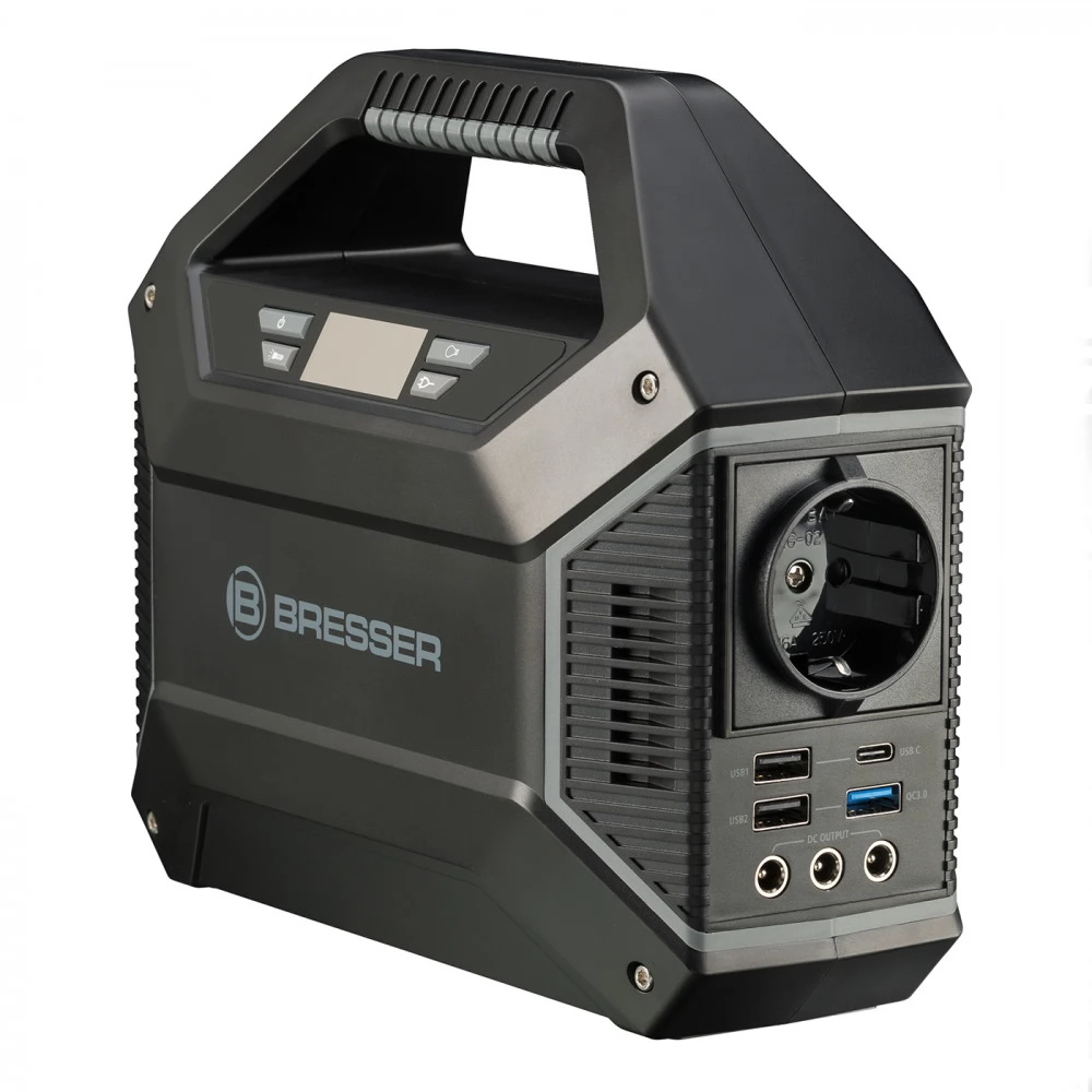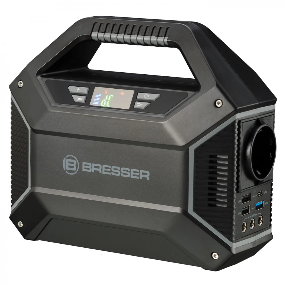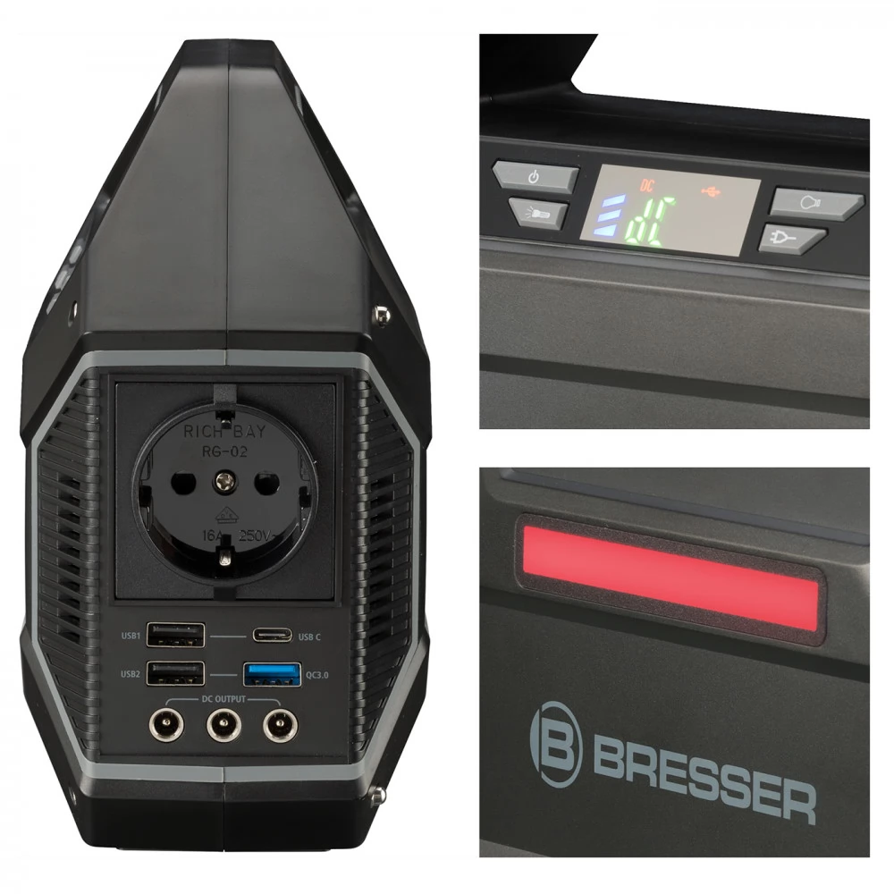 Portable energy storage (mobile powerbank) in maxi format from BRESSER. The high-performance and rechargeable 155 Wh lithium-ion battery can be used to operate and charge almost all common electronic devices with a wide variety of standard connection options. This means that there is always enough energy in reserve, whether for harsh outdoor use, in the garden, or in the event of a power outage at home. Switchable red LED light with emergency function and red light strip for orientation in the dark with more than 100 hours of light operation. The mobile power plant is a quiet and environmentally friendly alternative to internal combustion engine power generators. With the built-in solar charge controller, the power bank can also be charged directly with a solar panel (available as an option).