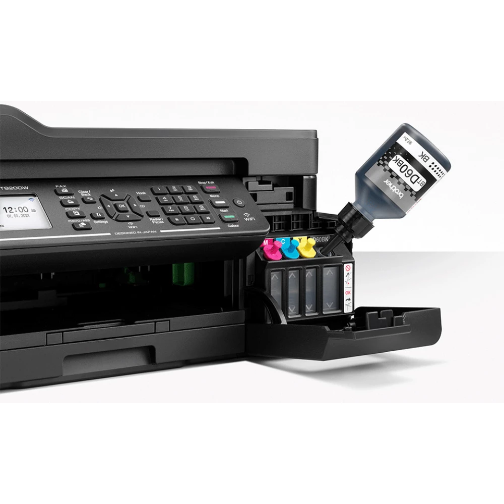 The MFC-T920DW box contains 2x black ink tanks (7500 pages), 1x cyan ink tank (5000), 1x magenta ink tank (5000) and 1x yellow ink tank (5000). Thanks to the ink tanks, you can set up the device quickly and easily and keep the cost per page low.