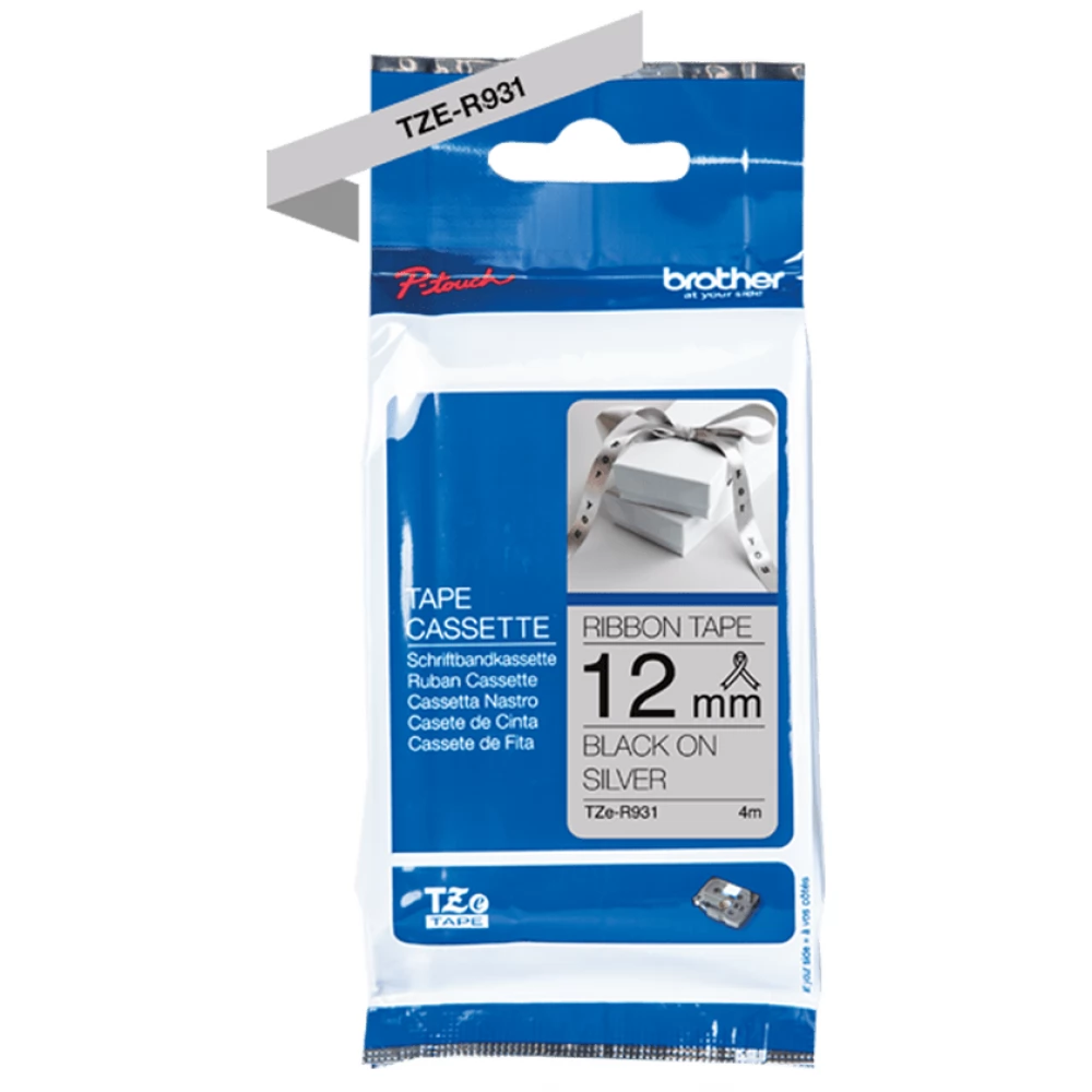 Brother TZe-R931 silk fabric P-touch tape, 12mm x 4 m, black on silver base.
