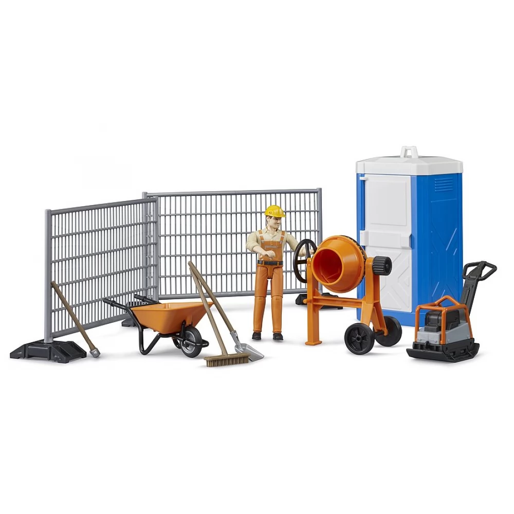 Construction set accessory for Bruder vehicles with a worker figure, concrete mixer, tools, fence and other accessories.