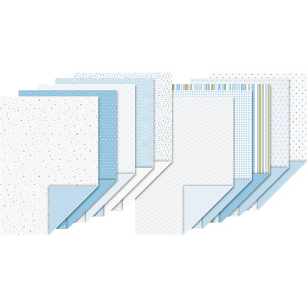 A set of 20 sheets, A4 size, patterned cardboard with a blue shade glued on top. 10 motifs, the reverse side is white and blue. 10 pieces weighing 130 g/m2 and 10 pieces weighing 220 g/m2.