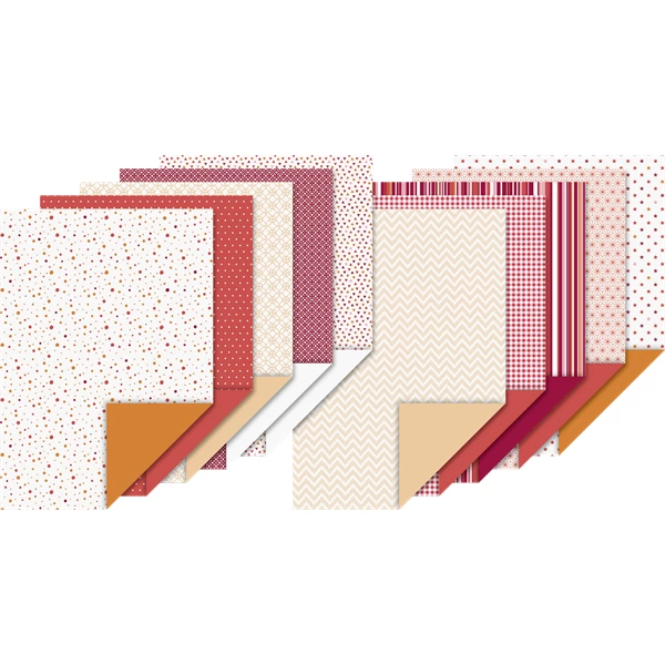 A set of 20 sheets, A4 size, glued on the top with a red shade, patterned cardboard. 10 motifs, the reverse side is white and pink. 10 pieces weighing 130 g/m2 and 10 pieces weighing 220 g/m2.