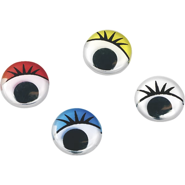 20 plastic, round moving eyes. Diameter 12 mm. Yellow, red, blue and green eyelids black lashes with black pupil.