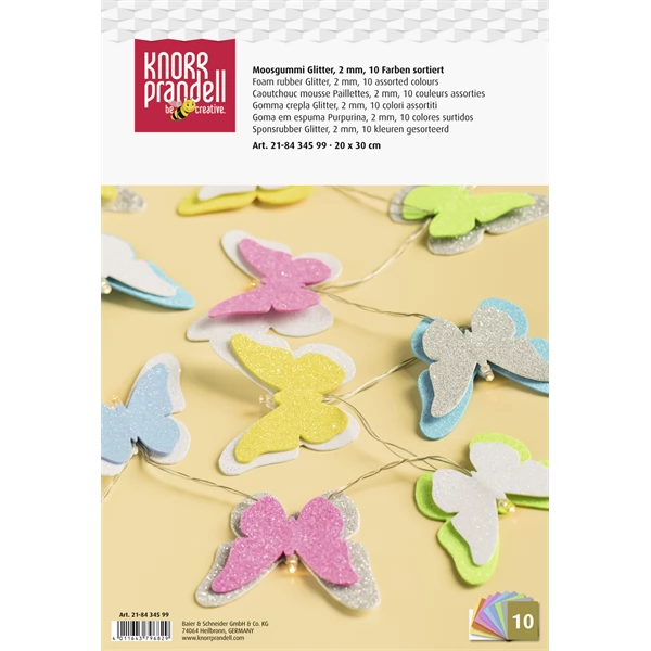 2 mm thick, 20x30 cm creative, glittery decorative rubber set in a package of 10 pieces. Soft, easy to shape and cut with scissors, DIY knife or scalpel. The package contains 10 iridescent colors: white, yellow, orange, antique rose, rose, light blue, turquoise, light green, silver, gold. Due to its waterproof properties, it is also suitable for making garden decorations.