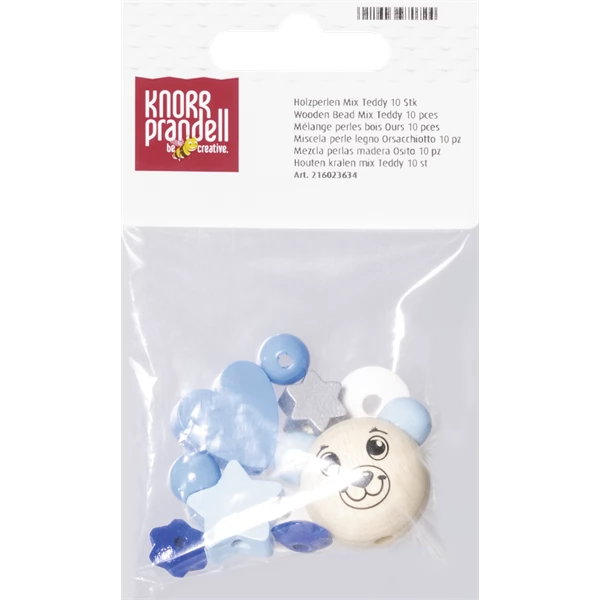 It is also suitable for making a 10 -piece, teddy bear motive wooden pearl package. FSC® with Bükk and maple wood. In blue. Bore diameter 2.5-3 mm. The colors used are tested on phthalate, saliva and sweat resistant. It was made in Germany.
