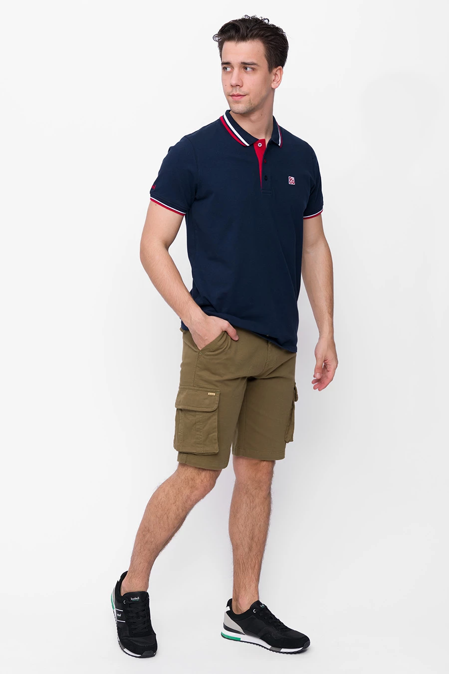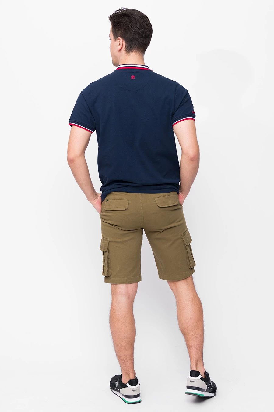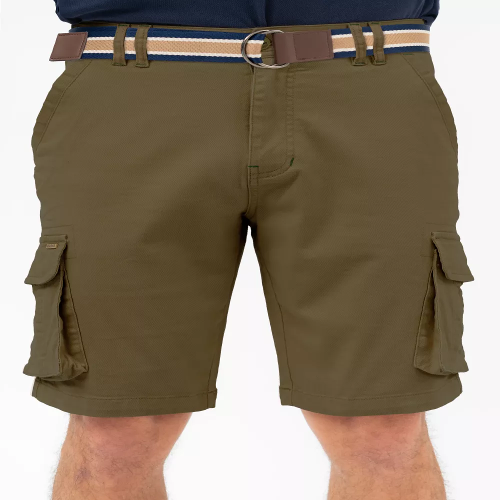 men's bermuda pants with side pockets in woven material, decorated with belt buckle and woven label