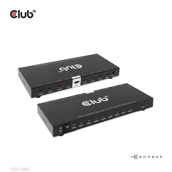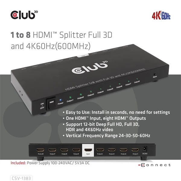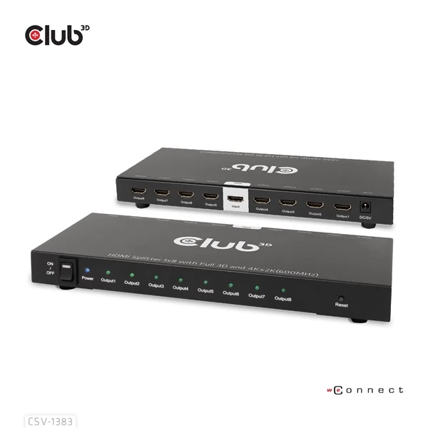 The Club 3D CSV-1383 is a high-performance and small 1 to 8 HDMI ™ Ultra High Definition Splitter for hot and iron. The input of the HDMI ™ signal is divided into eight identical outputs at a time. Provides high quality audio and video signal via HDMI ™ cables up to 4K@60Hz, and can receive and forward up to 6Gbps/600MHz.