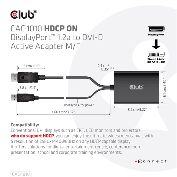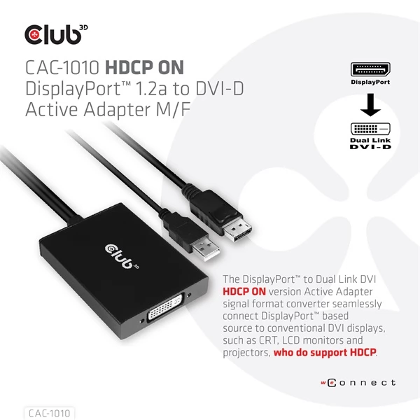The Club 3D CAC-1010 DisplayPort ™ + USB Type A TO Dual link DVI is an active adapter is a signal transformer that smoothly connect the DisplayPort ™ based source with conventional DVI screens such as CRT, LCD monitors and HDCP compatible projectors. You can enjoy the maximum resolution of 2560x1440@60Hz on any HDCP display. Ideal for digital entertainment centers, conference presentations and corporate training.