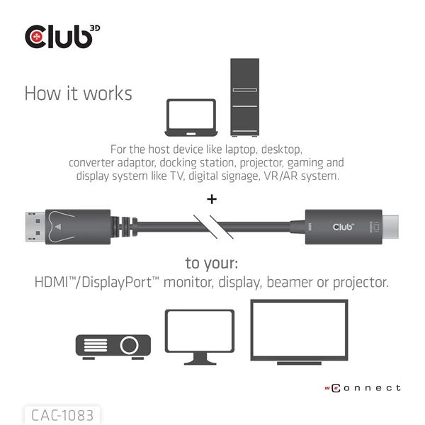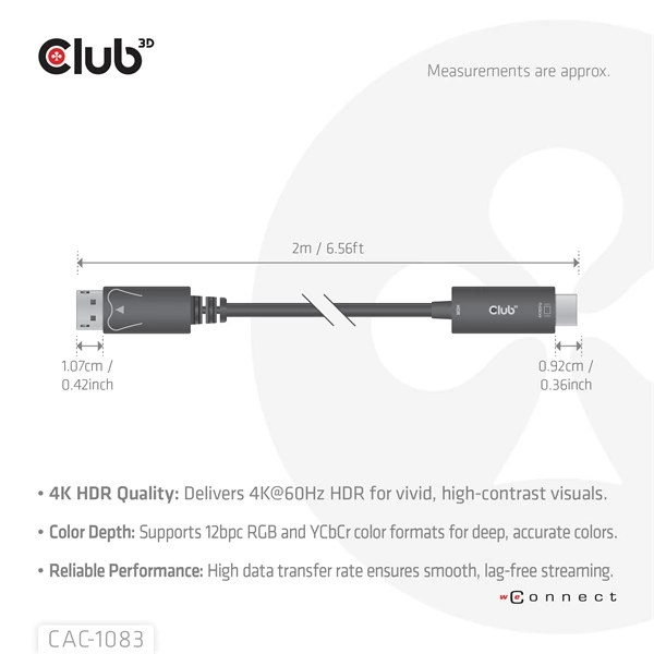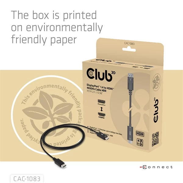 The Club 3D CAC-1083 is a DisplayPort ™ 1.4-HDMI ™ 4K60Hz cable with HDR M / M 2M / 6.56Ft. It supports HDR video quality deep color media content. DisplayPort ™ receives up to 5.4 Gbps per band for 4 lanes. The HDMI ™ output fully corresponds to the HDMI ™ specification.