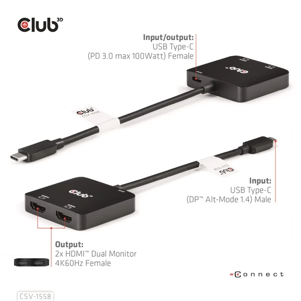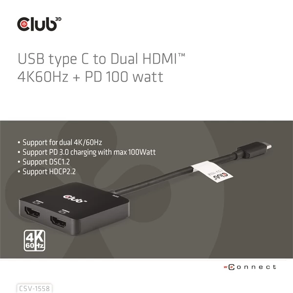 Club 3D CSV-1558 USB Type-C Dual HDMI ™ 4K60Hz + PD 100 Watt charging in DP1.4 Alt mode, allowing you to extend your host USB TYPE-C port to 2x HDMI ™, Ultra high resolution at a maximum 4K60Hz display. Supporting the MST function, the double display can be displayed at the same time with different video content. It also supports the PD charge with a maximum of 100 wat. It works on all USB Type-C or Thunderbolt ™ with all DP ™ Alt mode (including phones with USB Type-C connectors and DP ™ Alt mode).