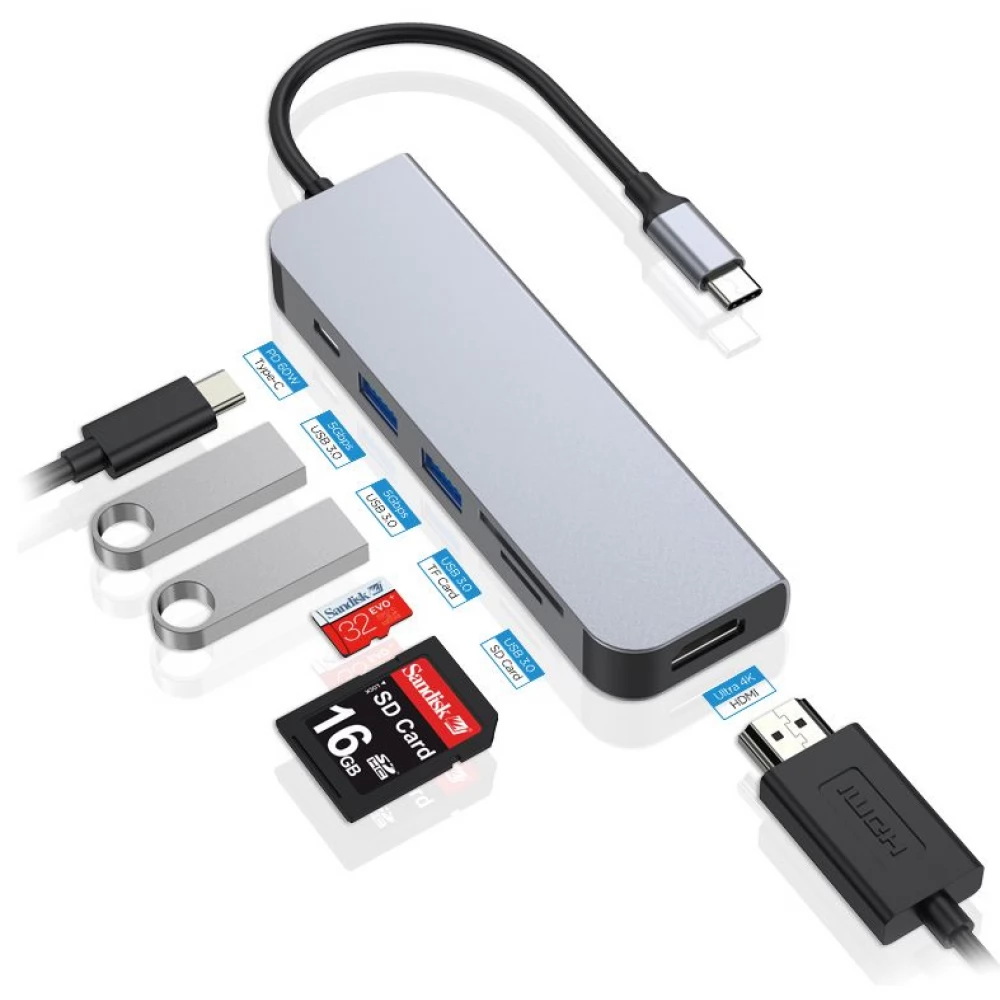 - 6 in 1 USB-C HDMI/USB-C PD/USB 3.0/SD/TF multi-port adapter