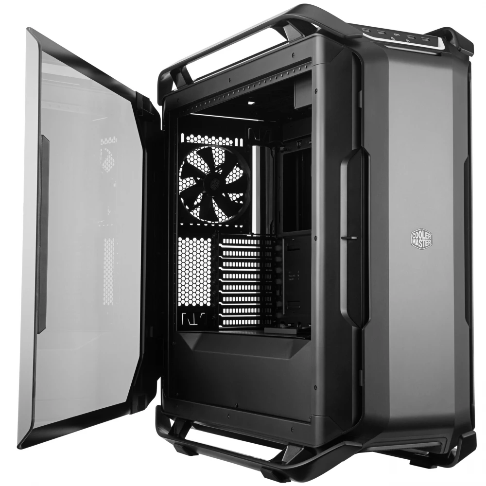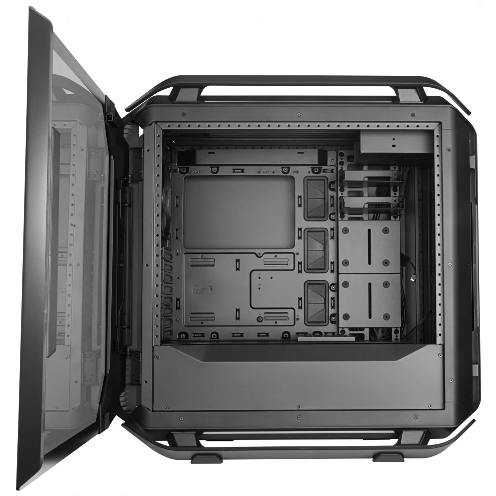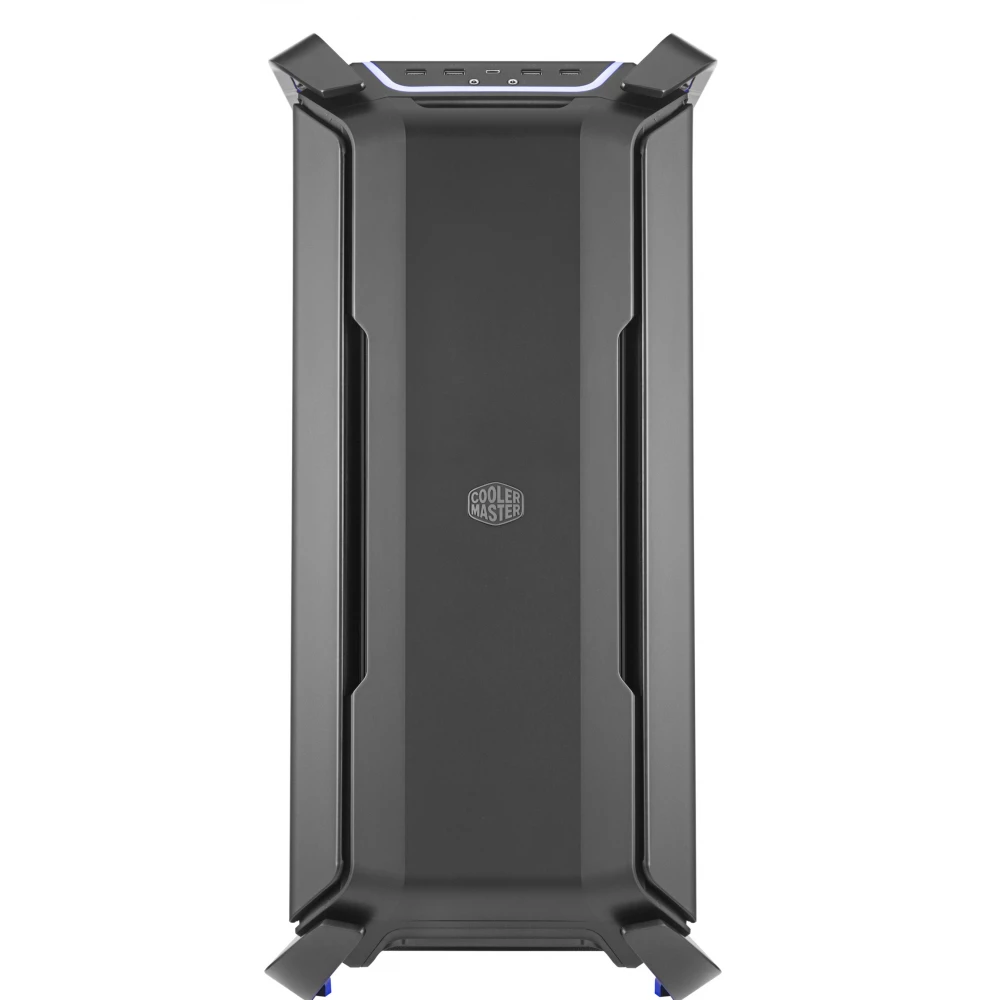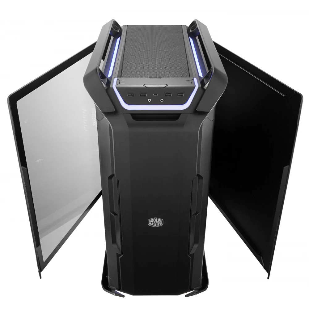 Quality steel structure computer case with curved tempered glass side panel, modular, changeable design and LED lighting.