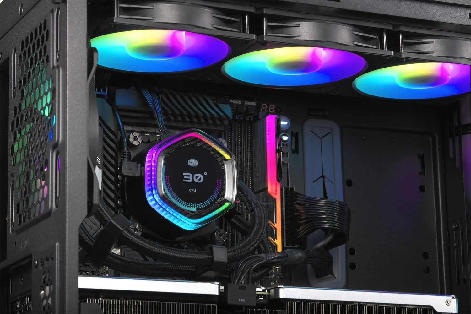 Compact universal water cooling with 3 120mm fans with controllable ARRGB lighting and PWM control, a 360mm radiator and a CPU cooling block with controllable annular ARGB lighting, which also houses a round display. The most important features of the cooling are the improved Gen X double-chamber pump and the 2.1" display on the CPU cooling block, which can be fully customized with the MasterCtrl application.