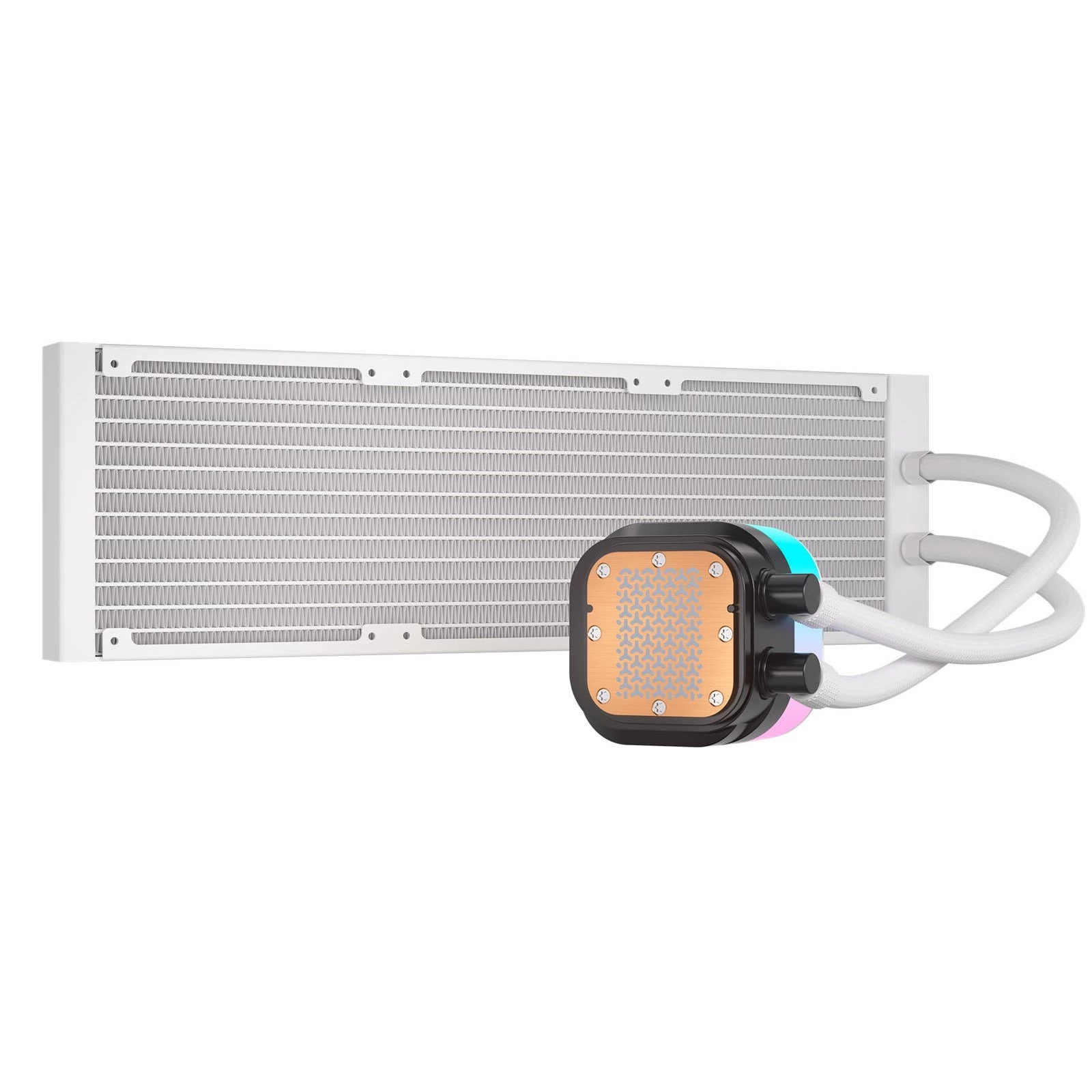 Compact, universal water cooling with 3 120mm fans with controllable RGB lighting and PWM speed control, a 360mm radiator and a CPU cooling block with controllable RGB lighting.