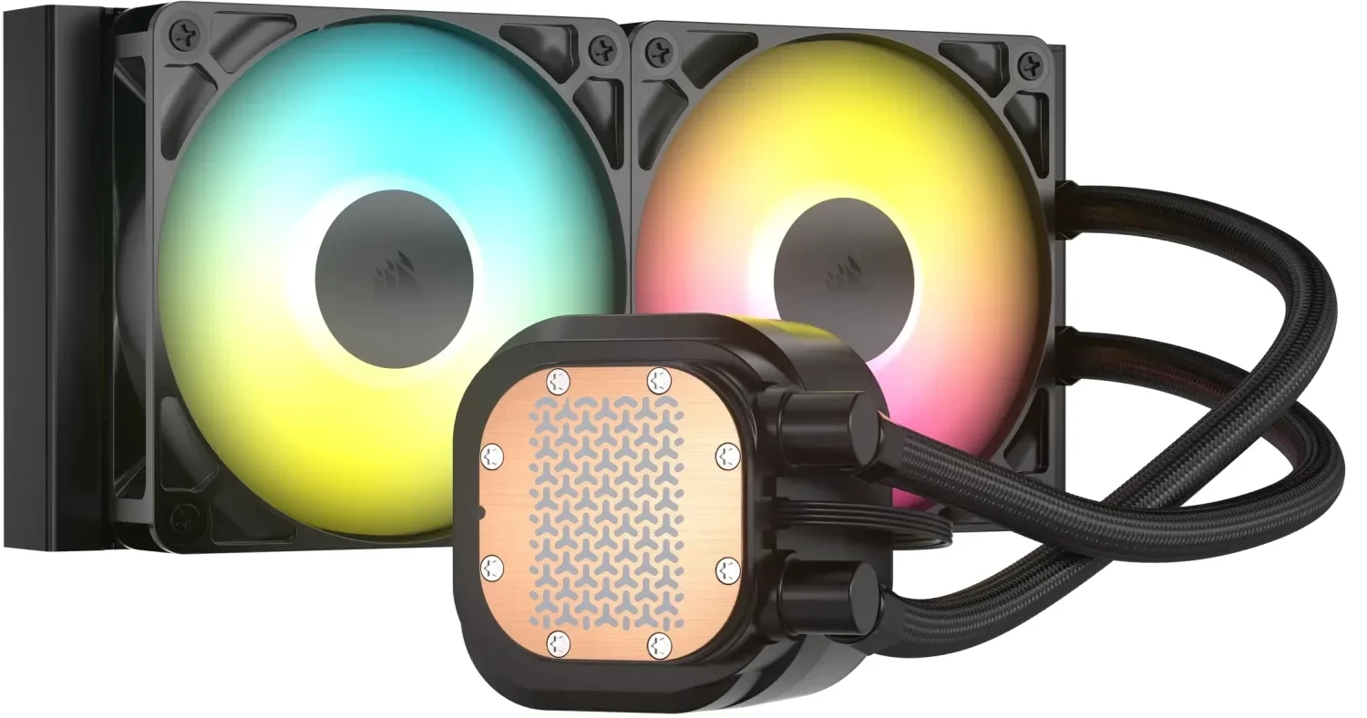 Compact universal CPU water cooling with 2 120mm controllable ARGB lighting, PWM speed control fans, 240mm radiator and elegant, controllable ARGB lighting CPU water cooling block.
