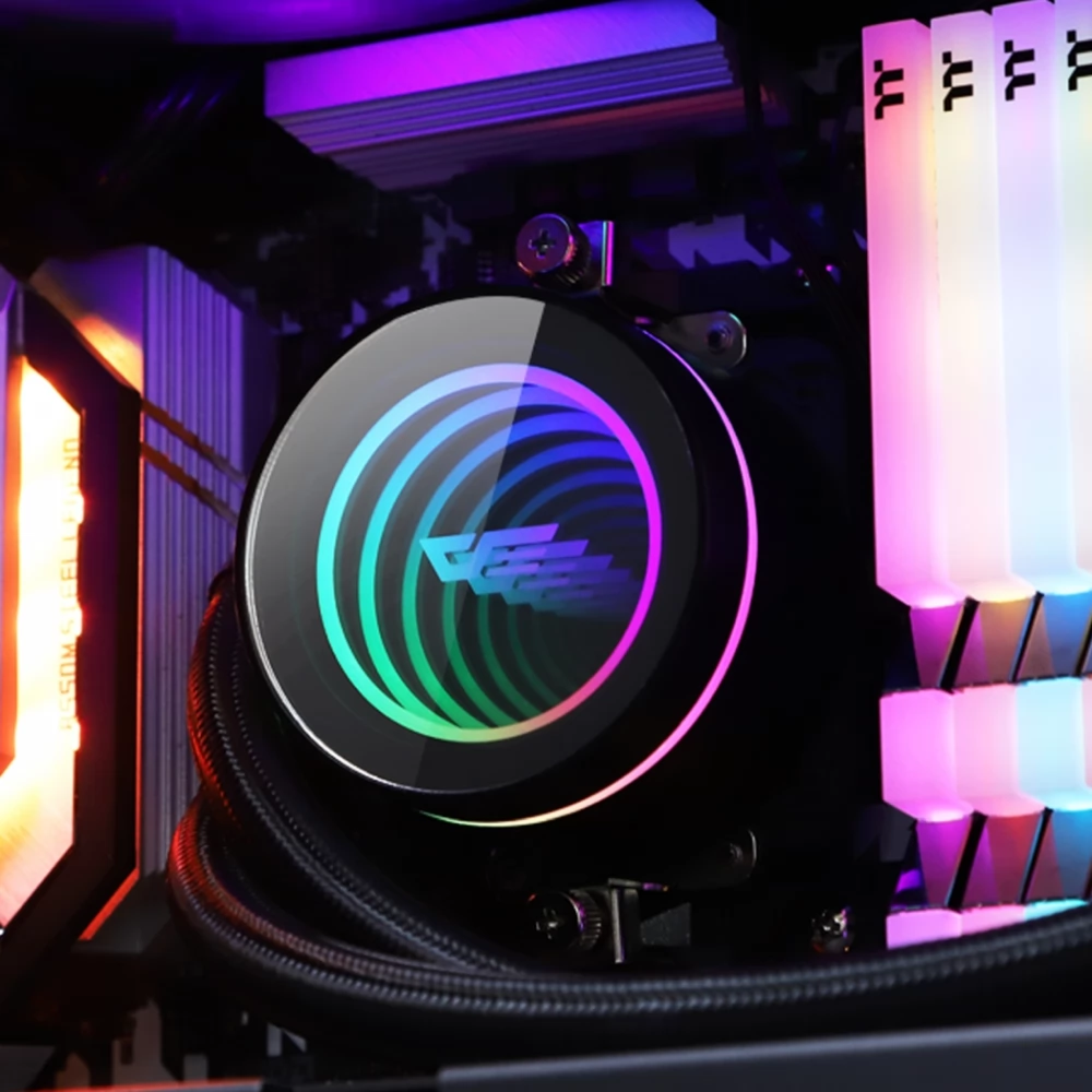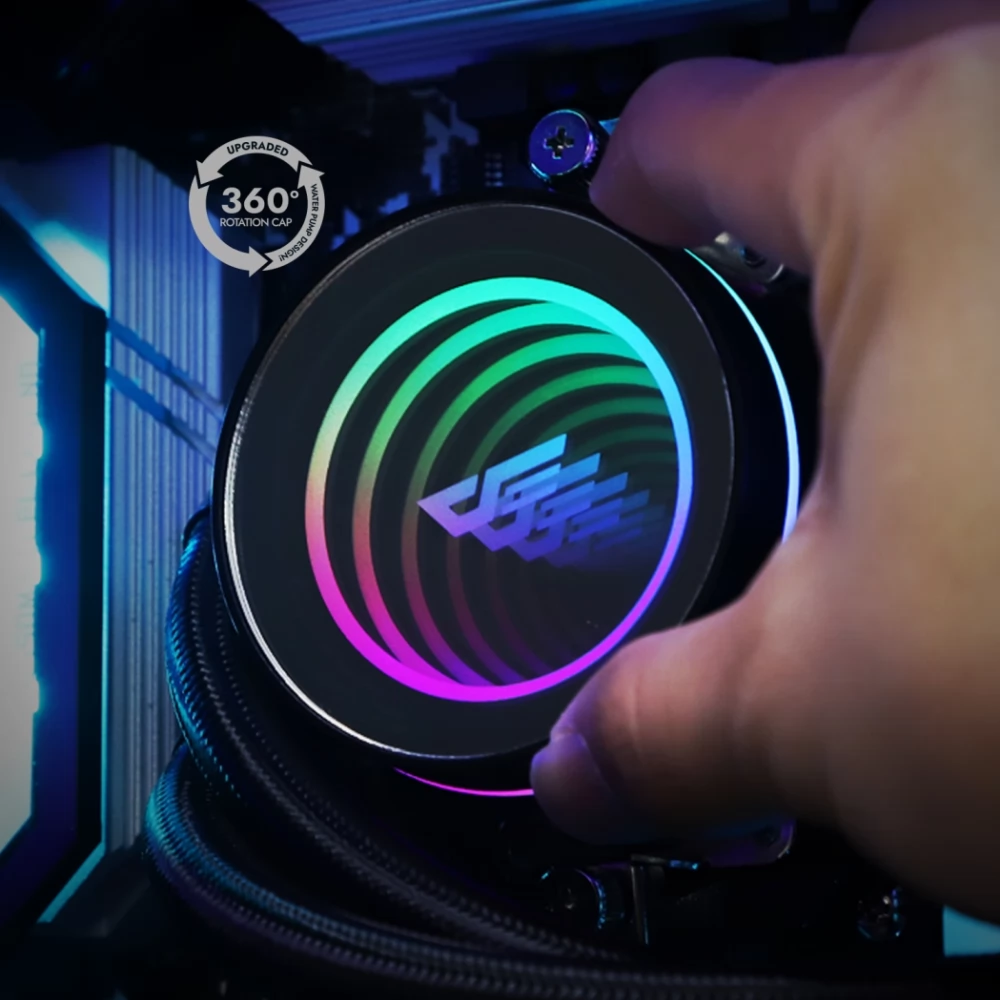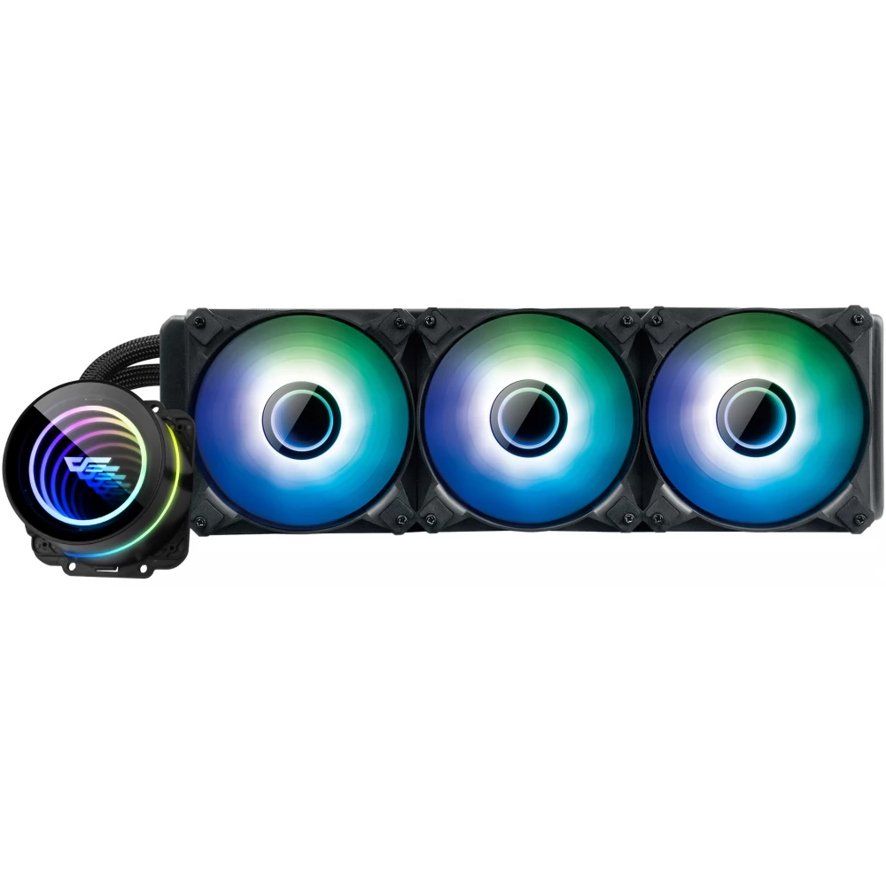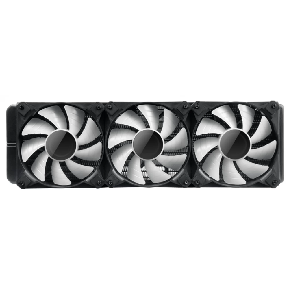 Compact, universal water cooling with 3 120mm fans and controllable ARGB lighting.